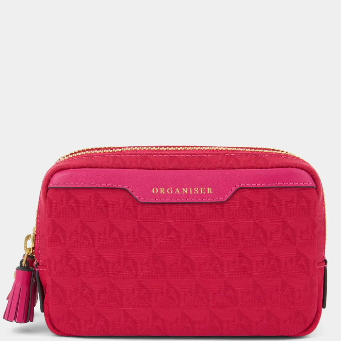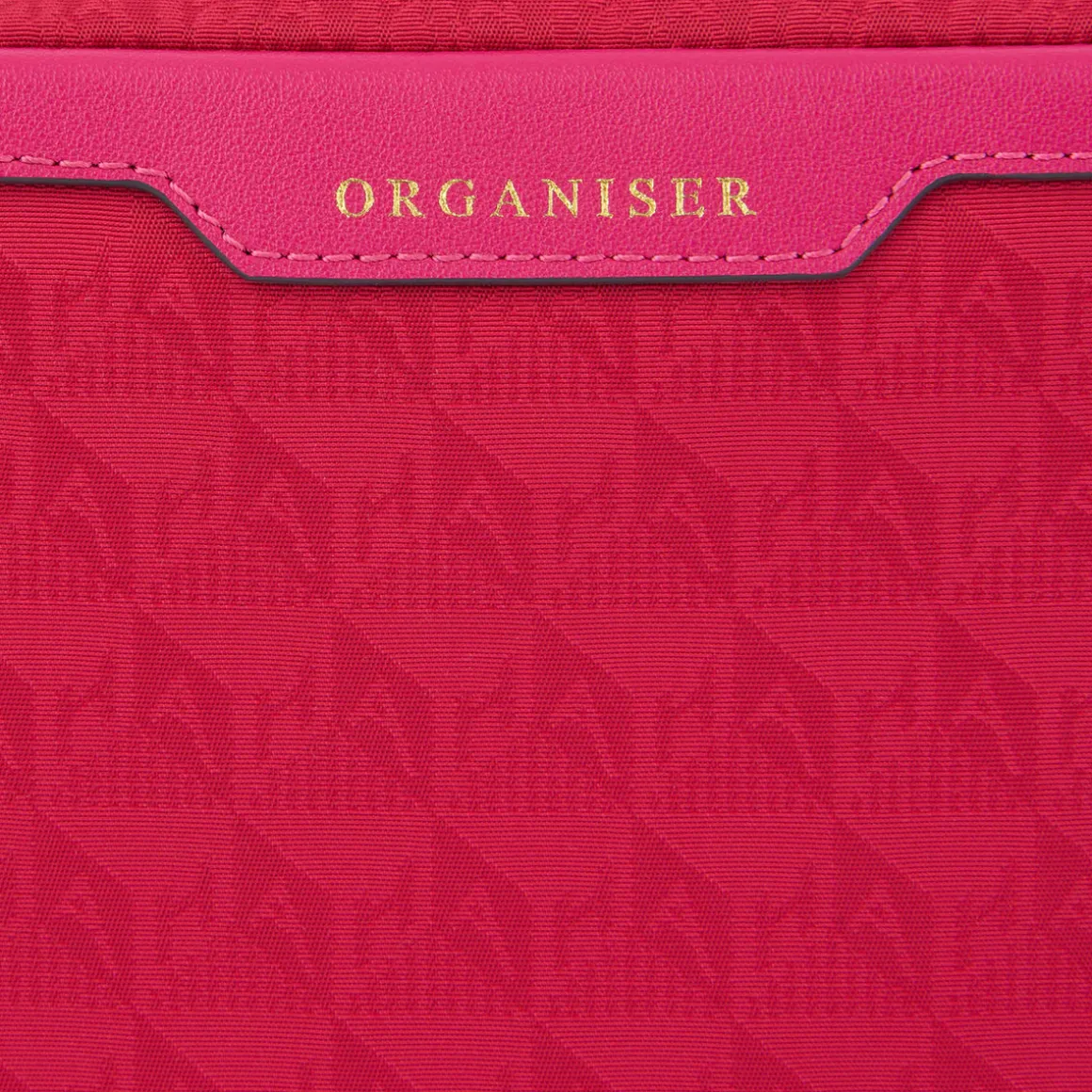 External features: Double tasselled zip, ORGANISER engraving, gold hardware