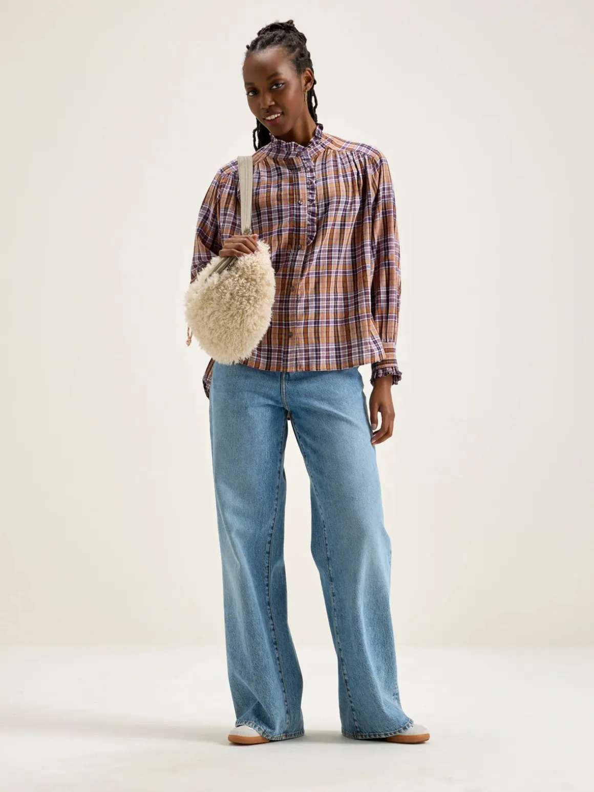 Checkered cotton blouse with gathered pleats and a raised collar.