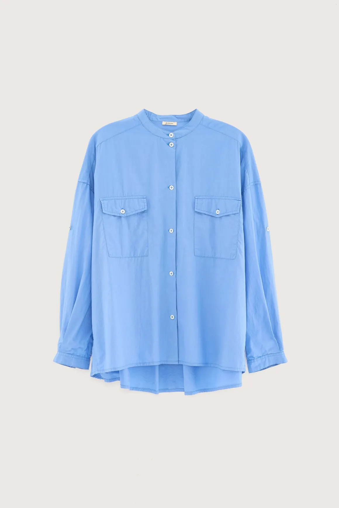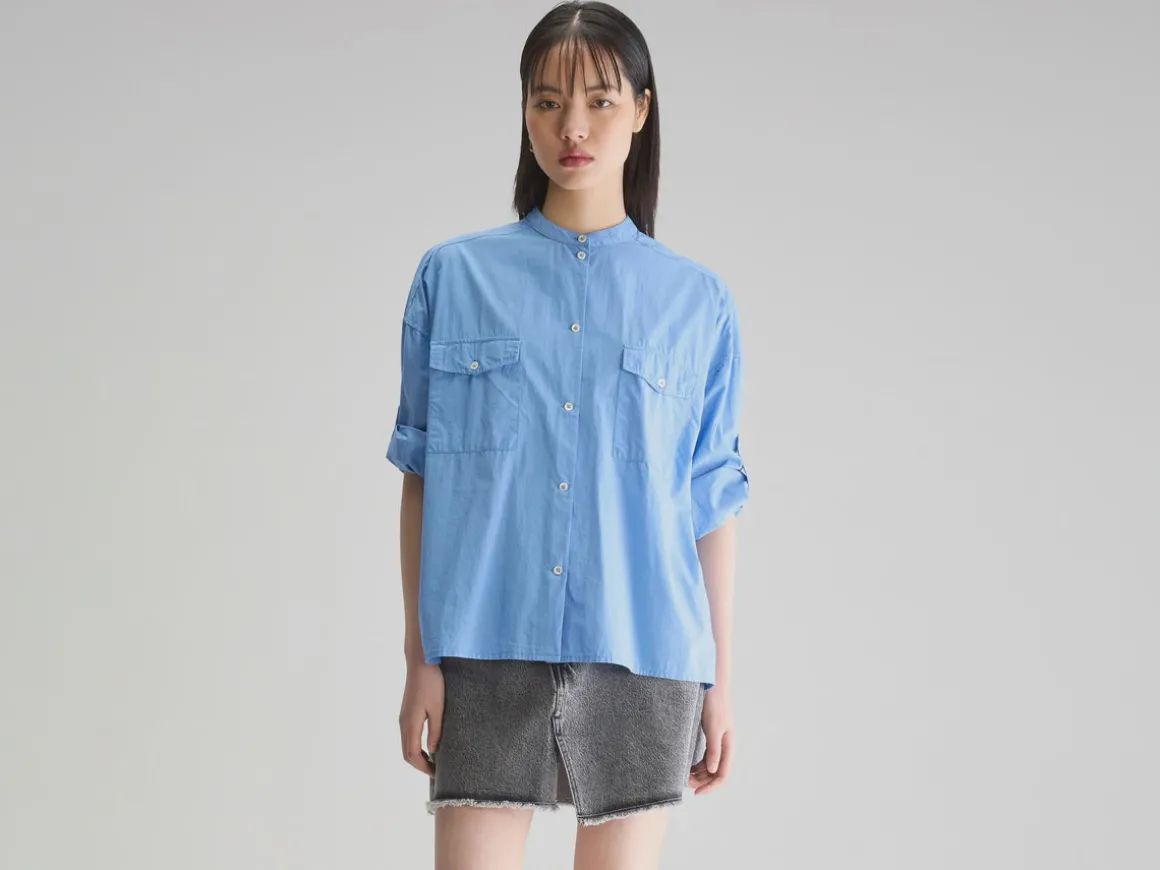 Unleash your style with this effortless BR Ketty Shirt in Blue Shirt. The relaxed fit, small stand-up collar, and patched pockets exude a sense of ease, while the Mid-blue cotton poplin fabric adds a touch of sophistication. The light crinkled finish enhances the unique charm of this must-have shirt. Elevate your wardrobe with this versatile piece.