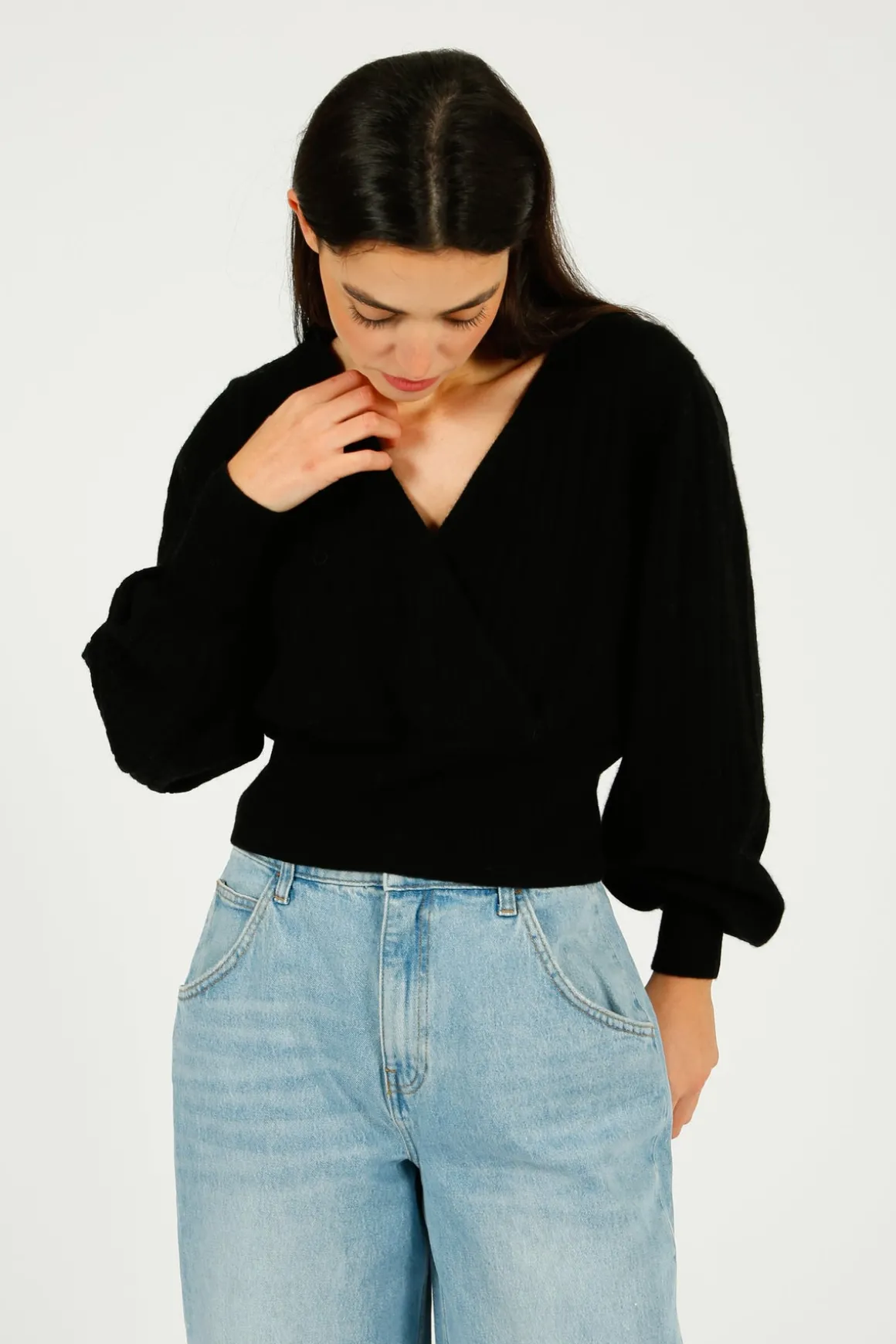 Indulge in luxury with the C-RUSH Kim Cross Over V in Black. Made from 100% cashmere, this sweater features a low, criss-cross v-neck and a ribbed knit for added texture. With long sleeves and a cropped fit, it’s both comfortable and stylish. The loose fit through the bust and banded waist provide a flattering silhouette. Elevate your wardrobe with this must-have piece.