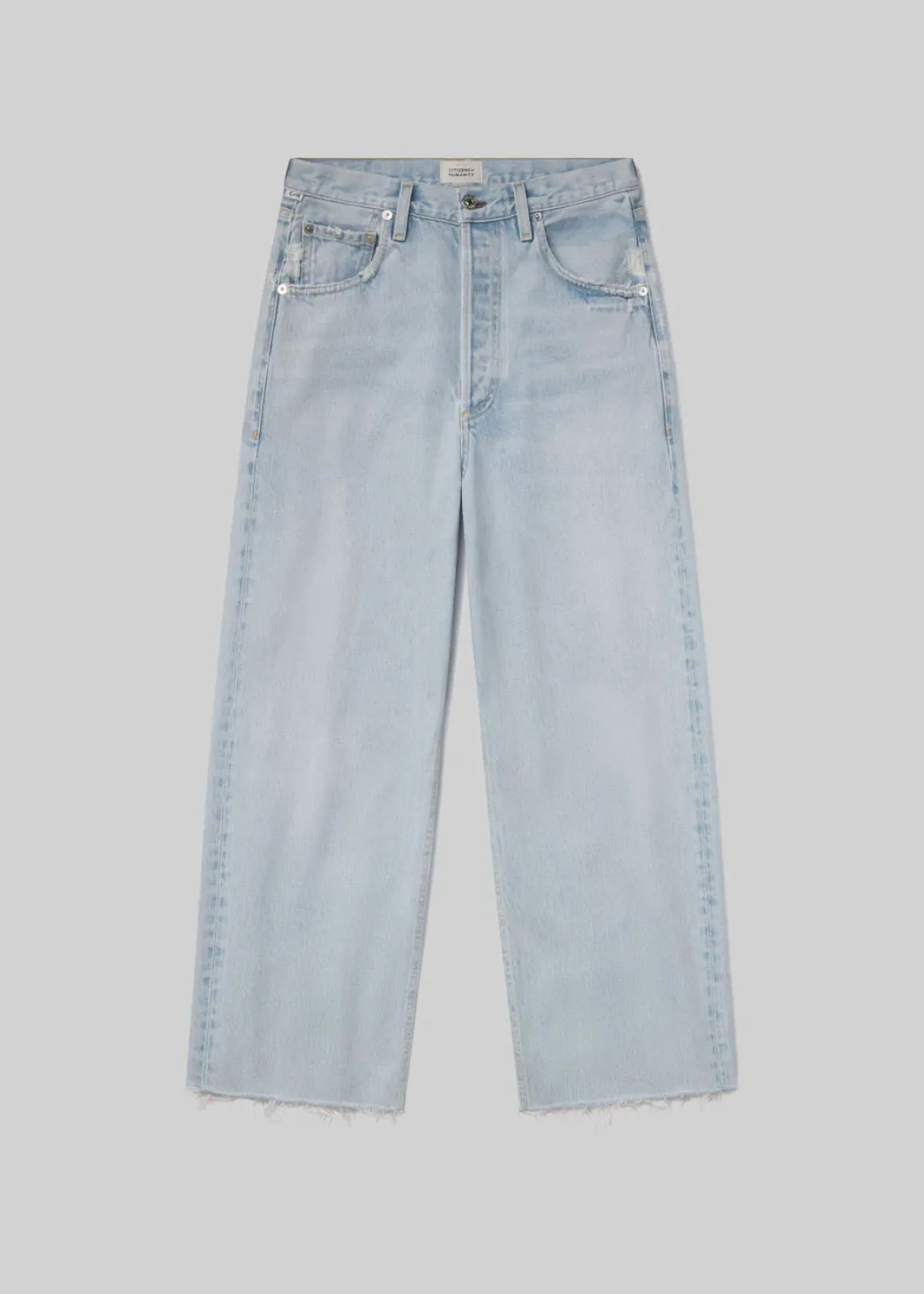 - Looks Like: Light indigo denim with fading, whiskering and raw hem