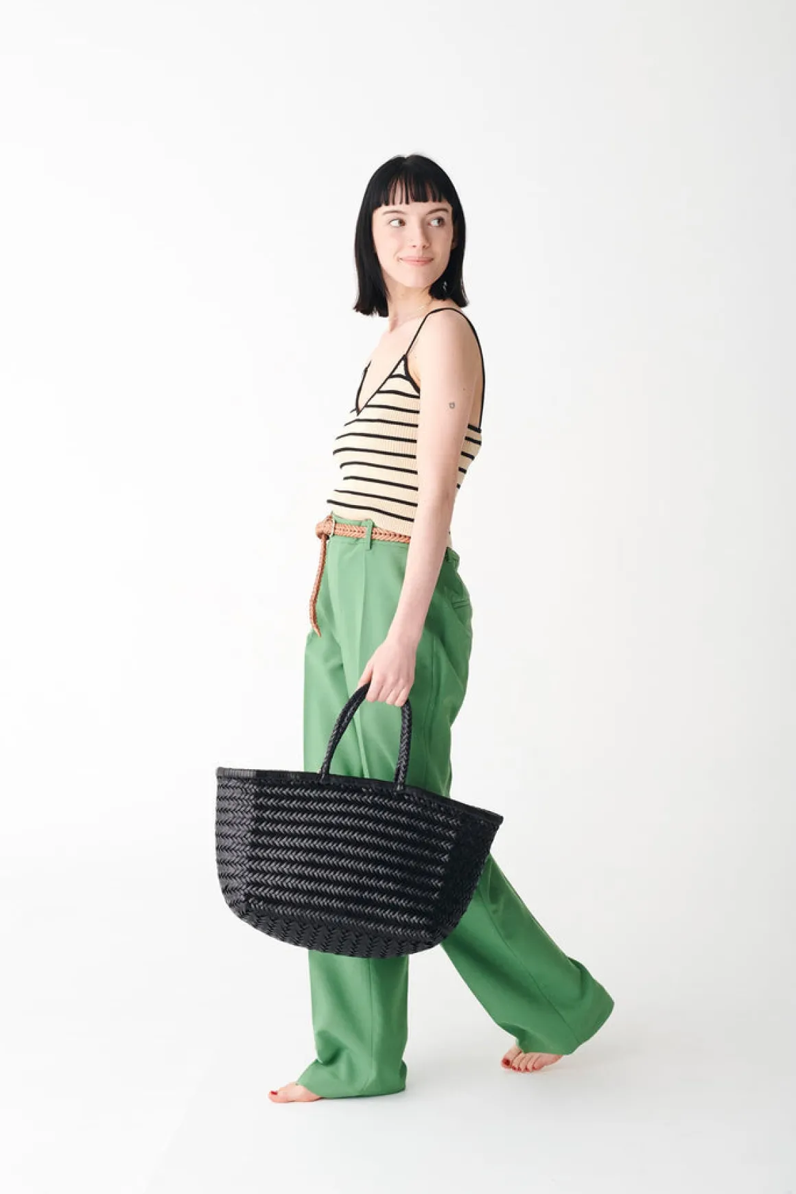 This is the bigger version of Dragon Diffusion’s iconic, best-selling bag—a roomy, hand-woven basket in smooth, buffalo calf leather. Handcrafted by our artisan weavers in one piece, the diagonal chevron weave is what makes this style unique. And, remaining true to traditional basket weaving techniques, the bag comes unlined with an open top. Ideal for your next beach outing or a trip to your local market.