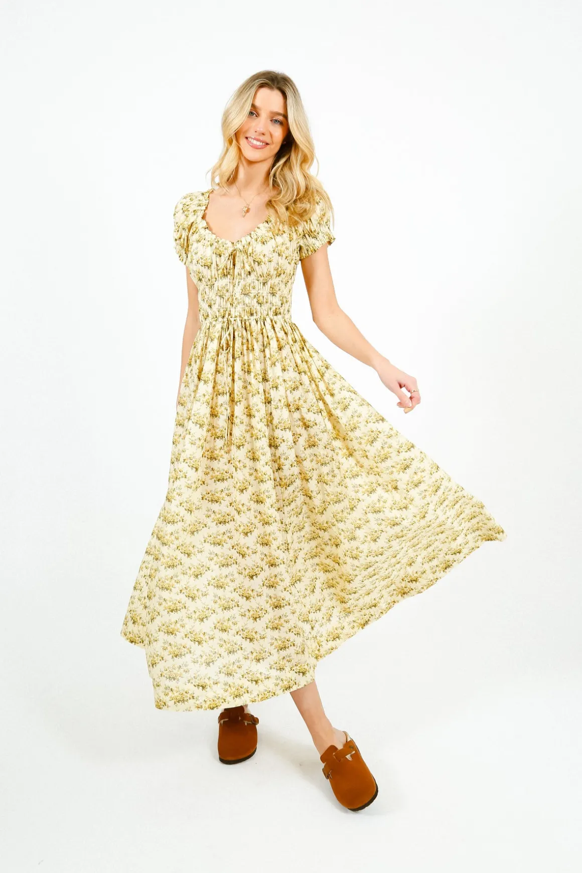 Indulge in the luxurious feel of this dress, expertly crafted from a soft and lightweight organic cotton voile. The delicate Victorian-inspired Rosier Floral design adds a touch of elegance to the Ashlynn Dress, which is reminiscent of the beloved Ischia. With short puffed sleeves and a functional center tie at the scoop neckline, this dress offers a flattering silhouette. The smocked bodice flows into a full, ankle-grazing skirt, while the adjustable waist tie ensures a perfect fit. Experience the vintage charm of petite ruffles on the sleeve cuffs and neckline.