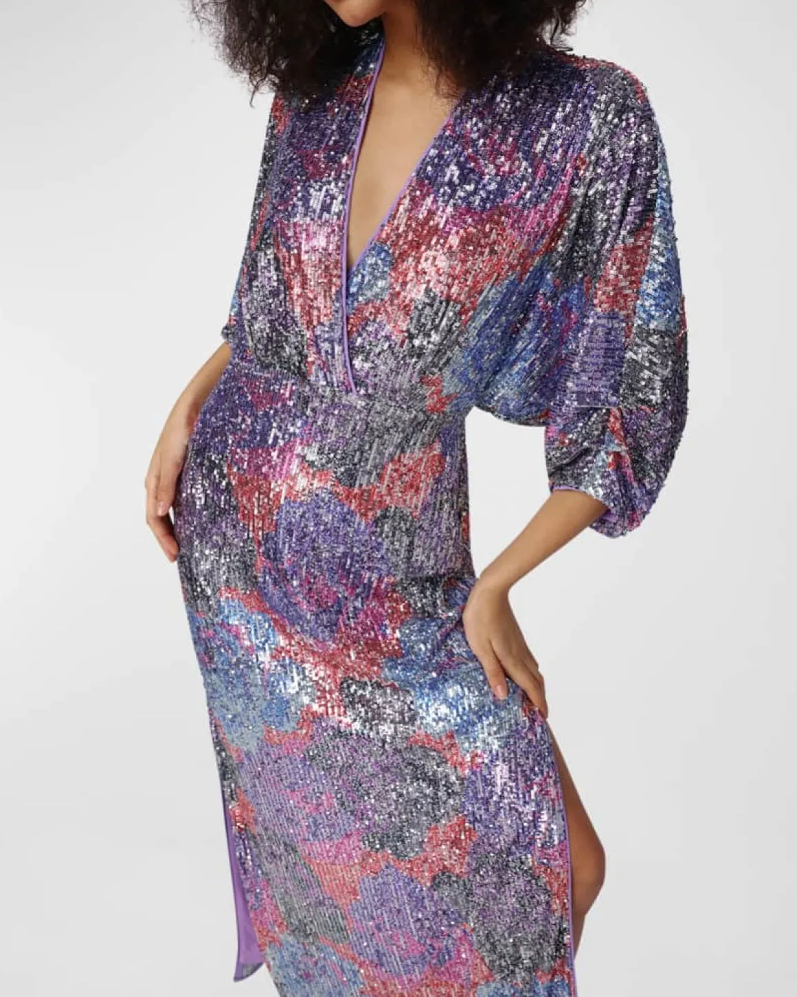Indulge in the mesmerizing beauty of the DVF Jessel Dress in Rose Blue, crafted with printed sequins for a dazzling and eye-catching effect. Featuring a deep V-neckline, bat-wing three-quarter sleeves, a cinched waist, and a seductive side slit, this maxi dress exudes a sense of glamour and playfulness.