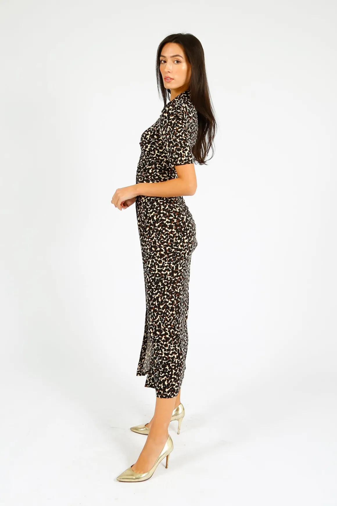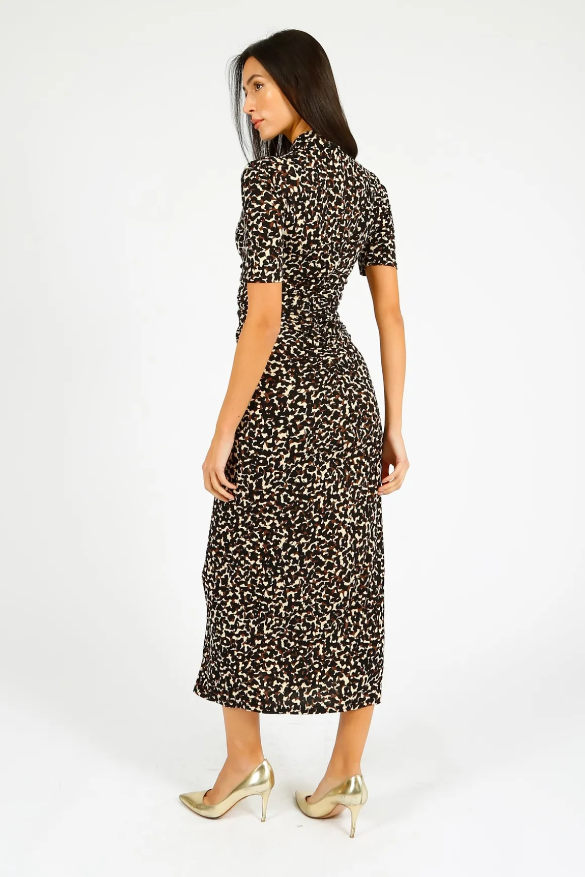 Experience the luxurious comfort and sleek style of the DVF Zoey Dress in Camo Leopard. Made with a premium soft matte jersey material, this midi dress features shirt-style tailoring, a classic collar, and elegant ruching along the back and bodice. With its soft feel and smooth finish, this dress is sure to make a statement.