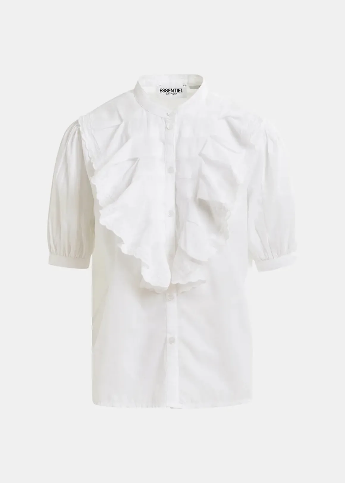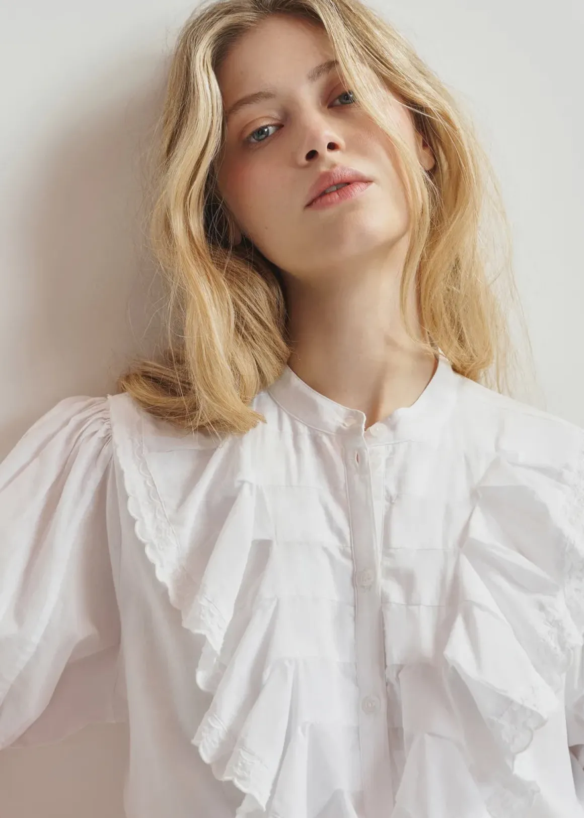 Shirt is crafted from 100% cotton and designed for a relaxed fit. It features puffed 3/4-length sleeves and a refined mandarin collar. The button-front closure is accentuated by delicate ruffles arranged in a V-line, creating a soft, feminine silhouette.