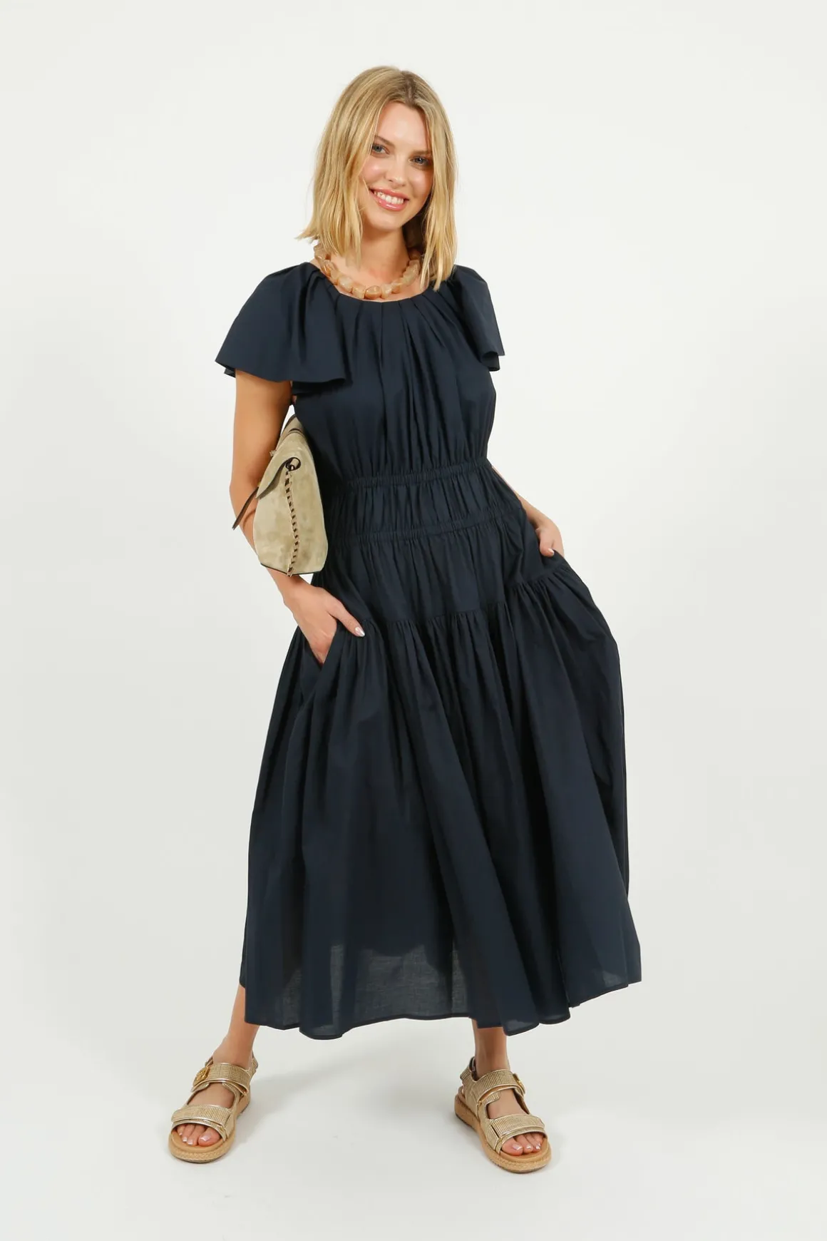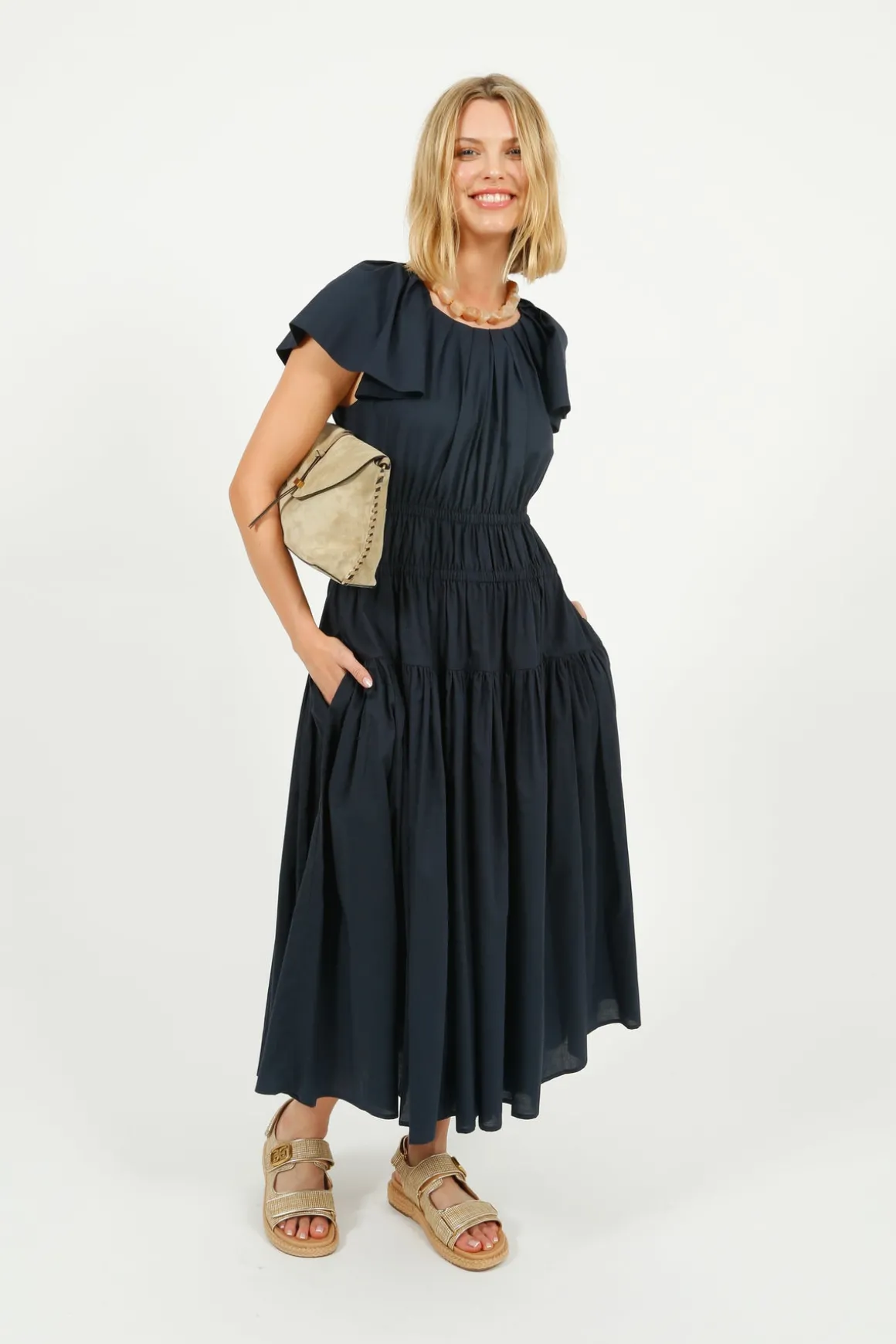 Featuring wide, structured shoulder detailing that creates a bold yet graceful look, it balances soft gathered ruching along the bodice and waist for a flattering fit. The tiered skirt adds volume, while discreet side pockets make it as practical as it is stylish.