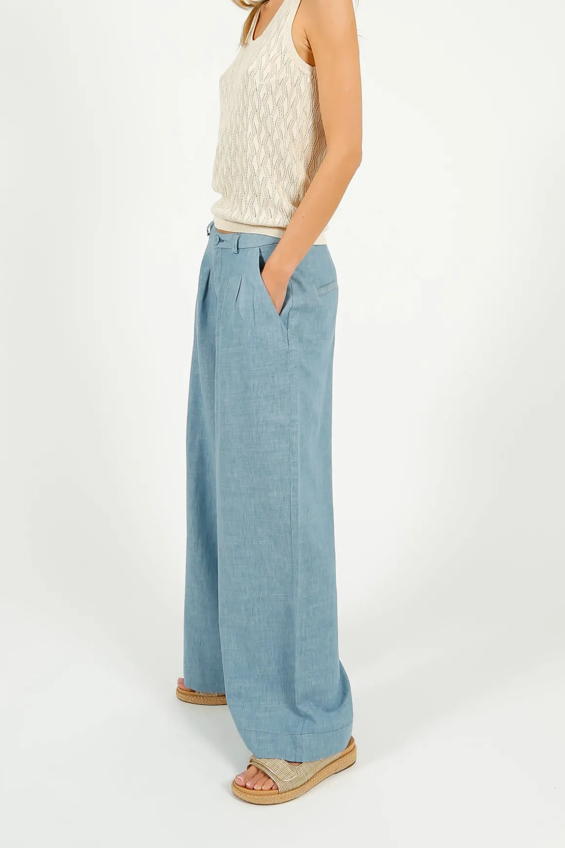 Introducing the Eu0026amp;I Belinou Linen Trousers in Blue, the perfect blend of 85% cotton and 15% linen for a soft, comfortable fit. With a loose fit and 2 front and back pockets, these trousers are a great staple for the summer. Easily machine washable and complete with 5 belt loops. Elevate your summer wardrobe with Belinou!