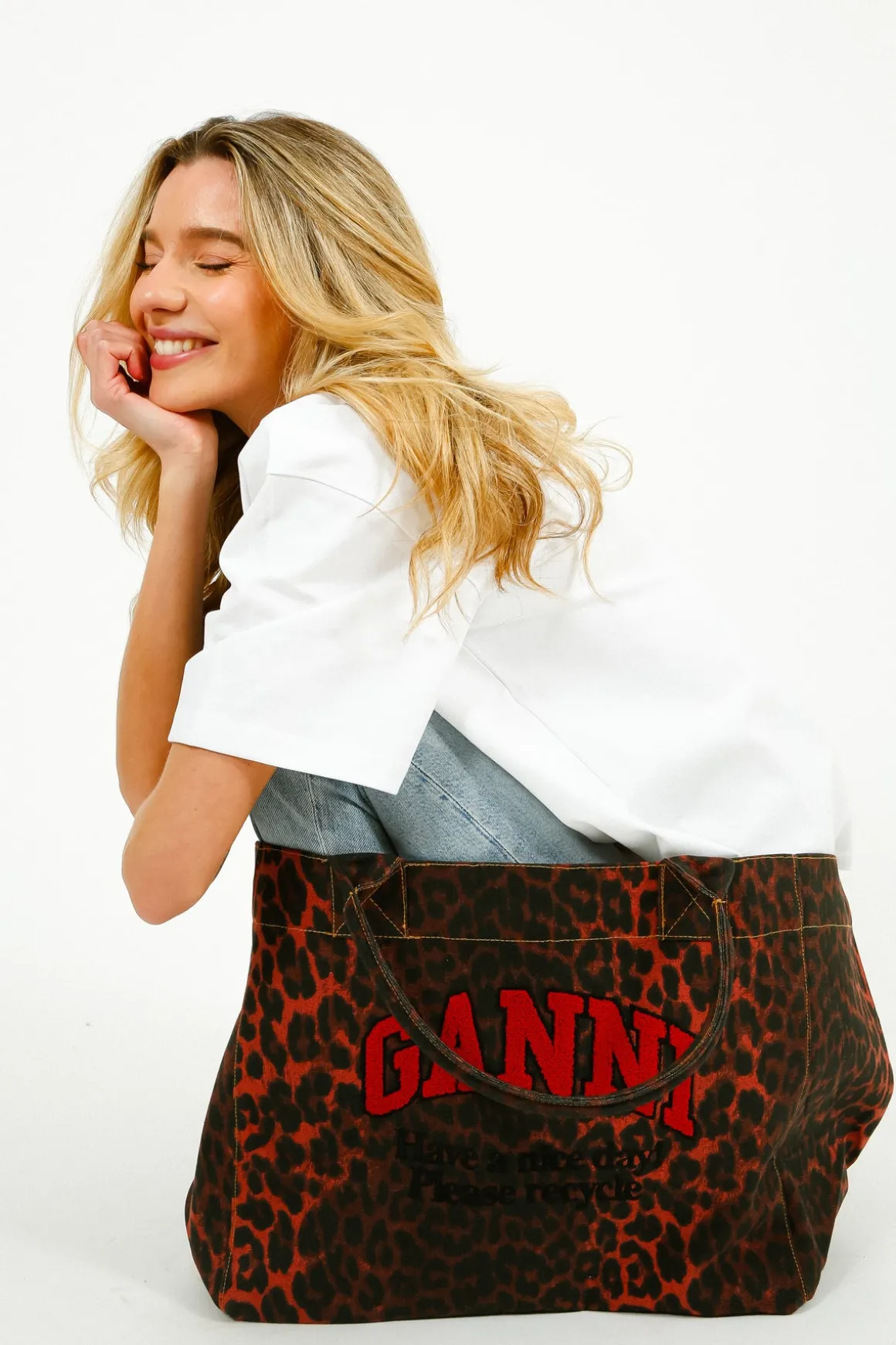 This XXL Red Leo Shopper from GANNI boasts top handles, a spacious main compartment, and a stylish logo featuring the phrase ‘Have a great day!