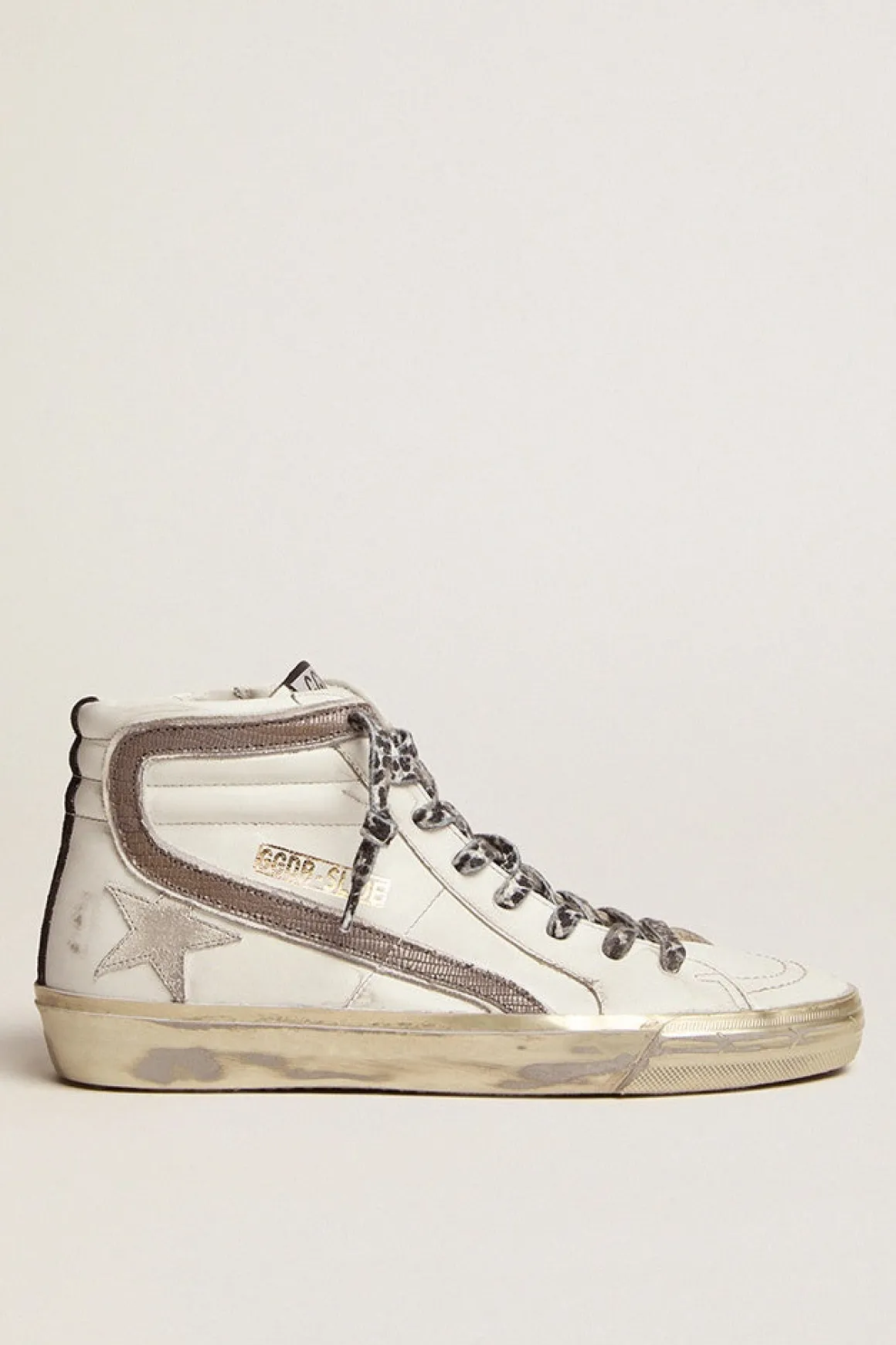 Designed with Golden Goose’s signature distressed look, these Slide trainers feature black and white laces along with curved side details. wear them with everything from denim to dungarees and dresses.