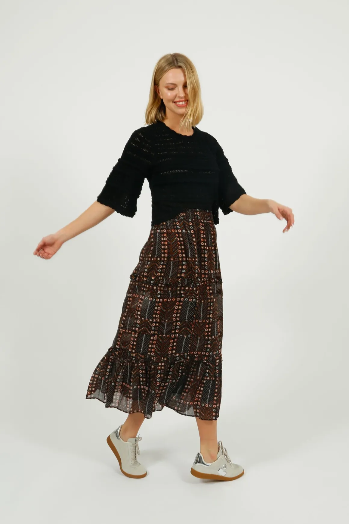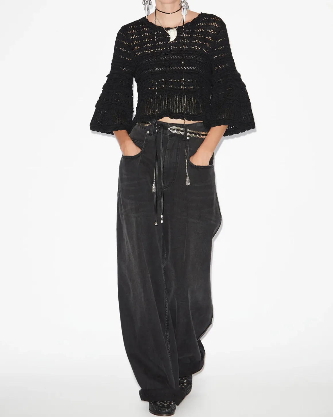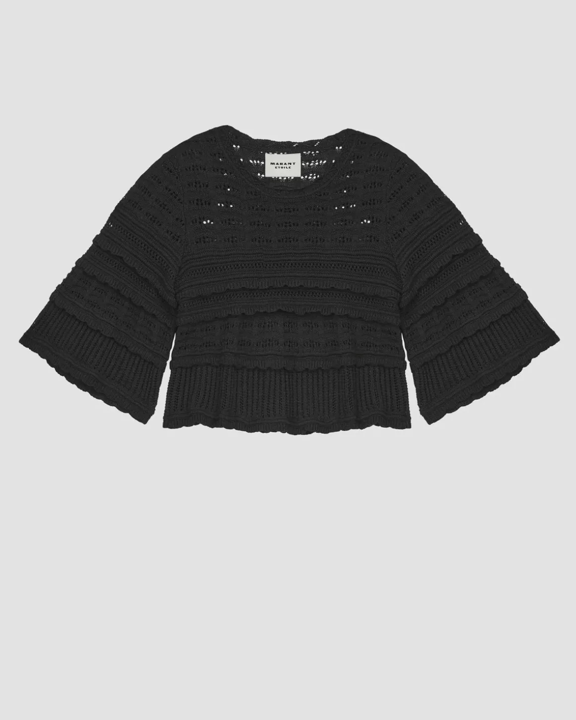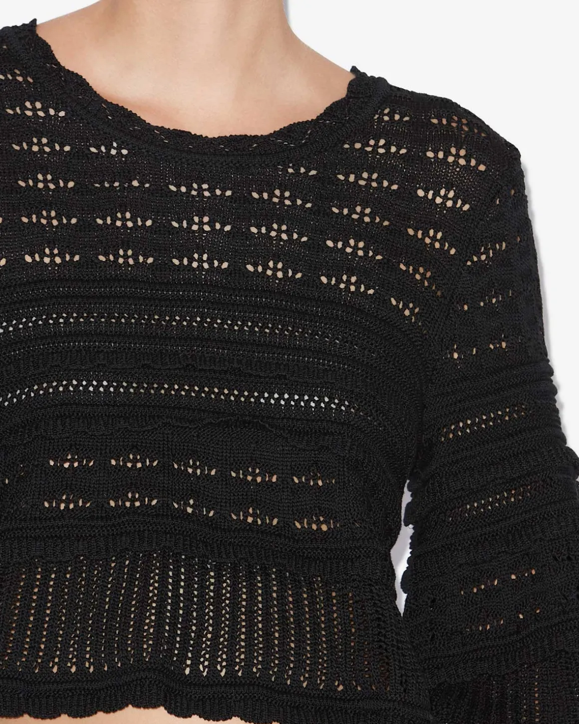 Indulge in luxury with the IM Azelia Openwork Top in Black! Made with 100% cotton, this top boasts a beautiful openwork knit design that is both comfortable and stylish. The round neckline and long flared sleeves add a touch of elegance to this loose-fitting top. Perfect for any occasion, feel confident and chic in the IM Azelia.