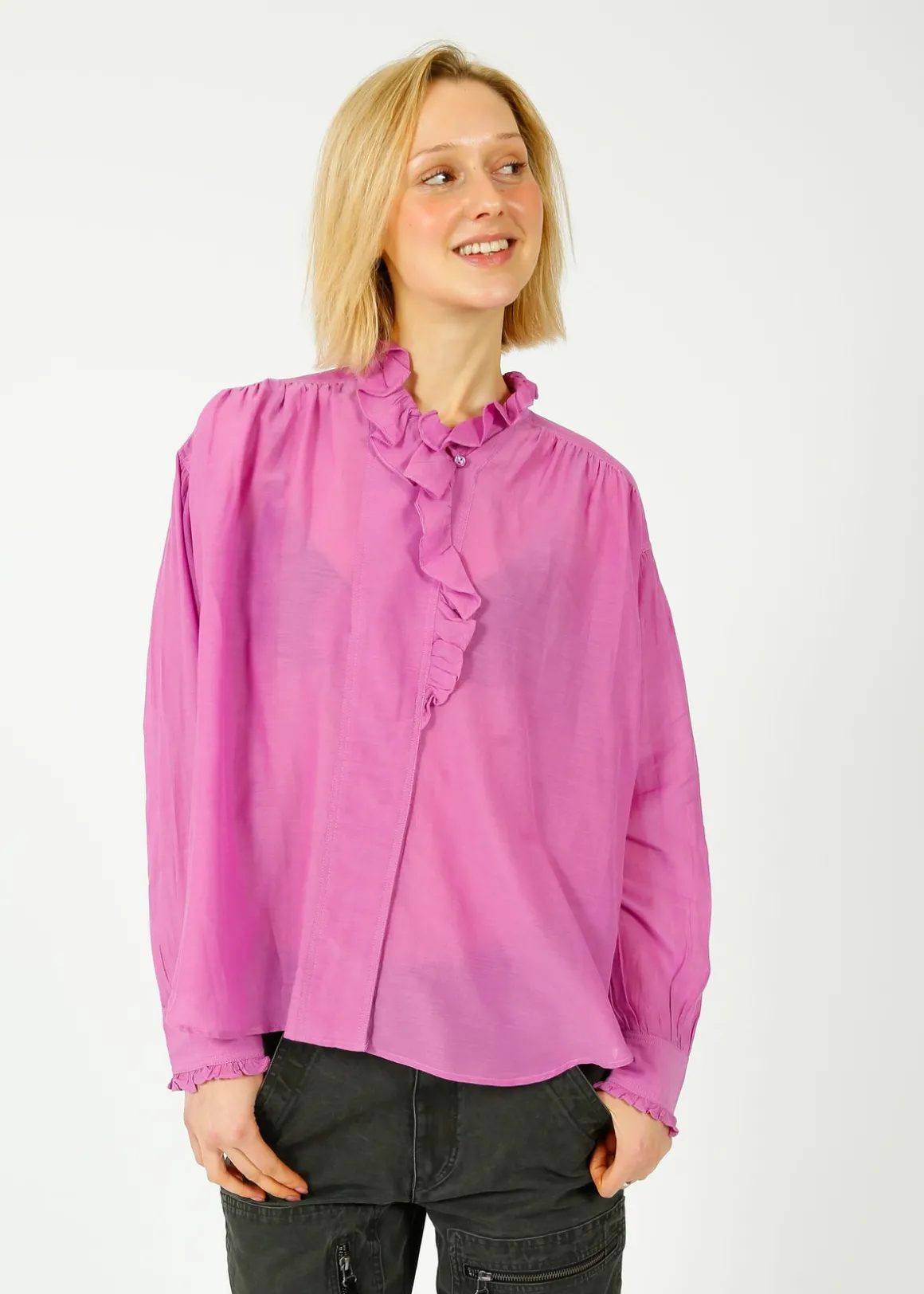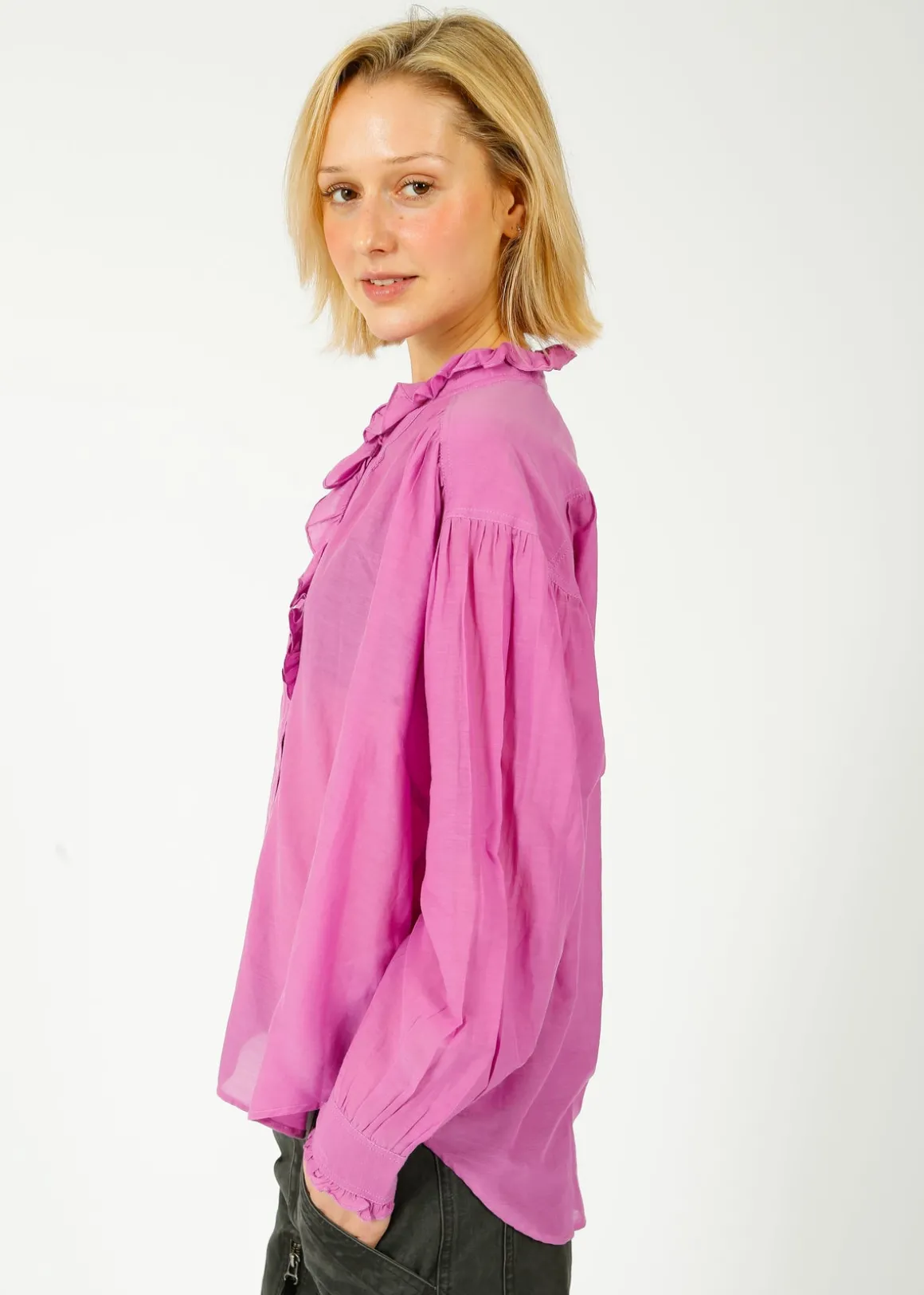 Transform your wardrobe with our IM Pamias Blouse in Pink Lavnender. Crafted from soft and breathable 100% cotton, this blouse boasts the iconic Marant relaxed fit and a charming ruffled collar. With its front button fastening and lightweight material, it effortlessly combines fashion with comfort. Elevate your look now!