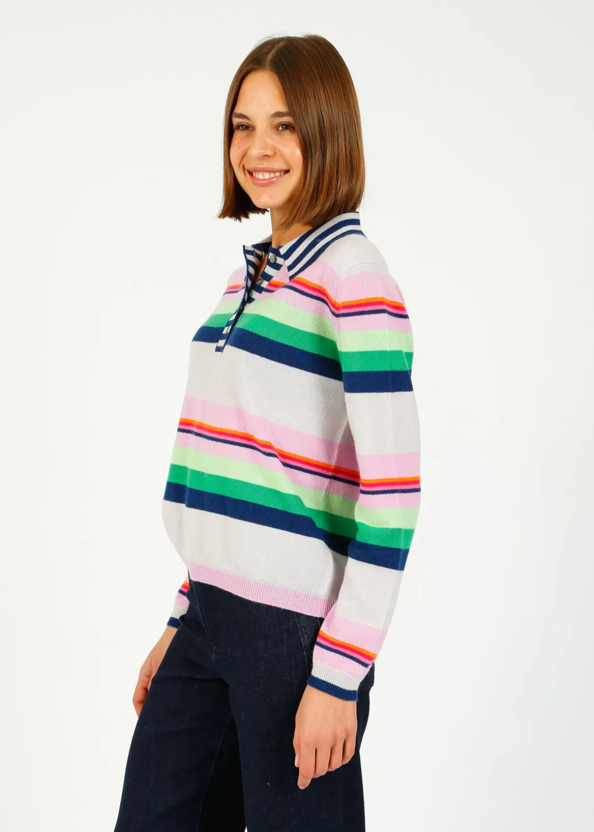 Introducing the JU Cabana Stripe Polo! Made with a luxurious blend of 70% wool and 30% cashmere, this polo offers ultimate comfort and warmth. The long sleeves and ribbed trim provide a snug fit, while the colourful knit and contrasting stripes add a stylish touch. Perfect for chilly days!