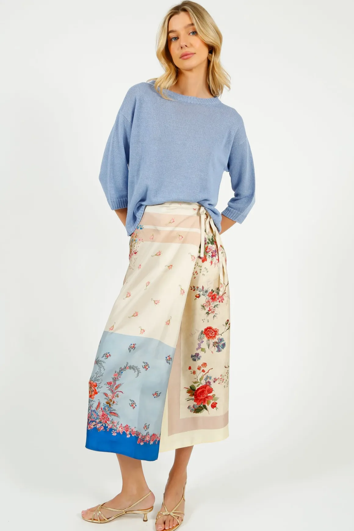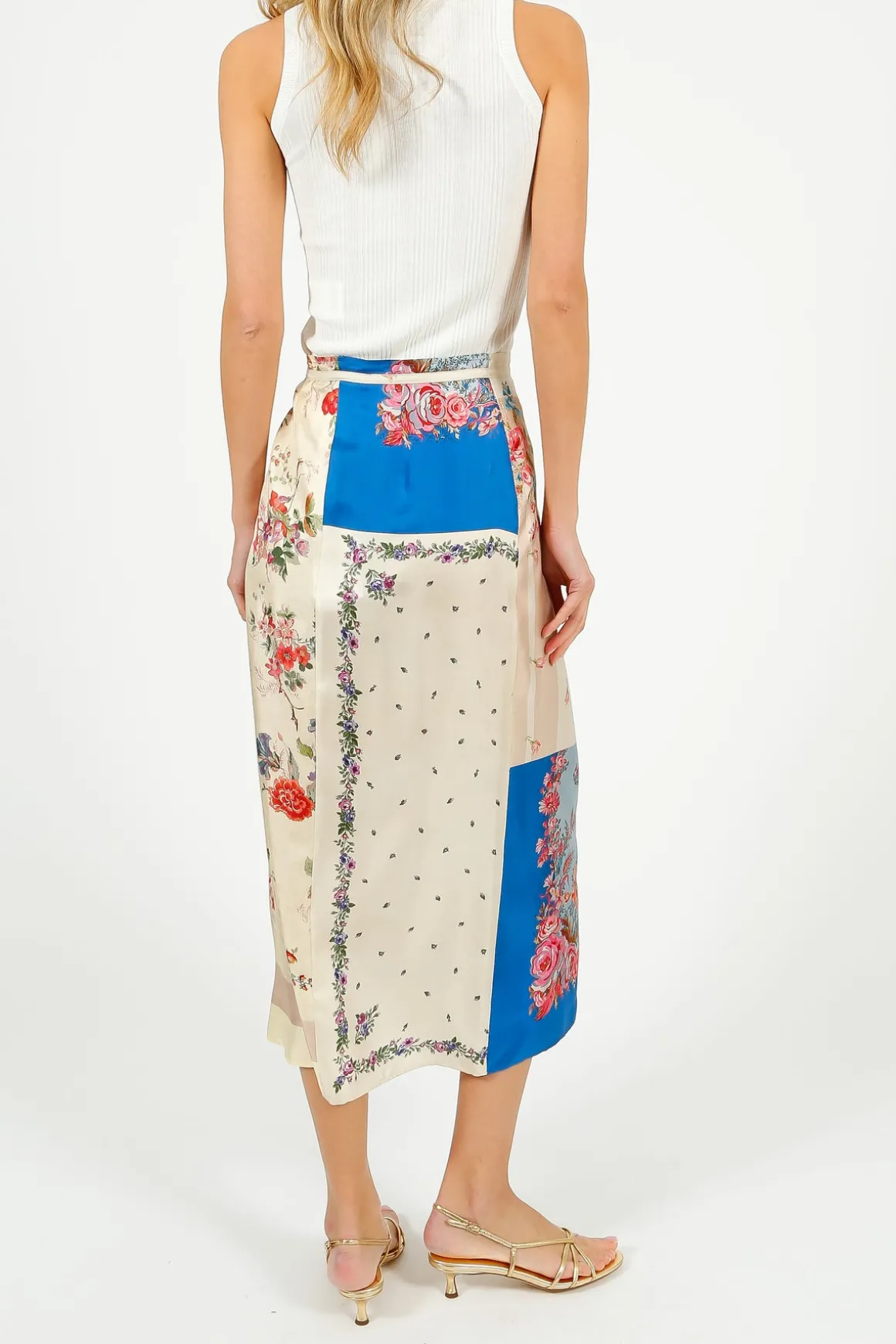 Midi wrap skirt, made of luxurious pure silk twill, with a foulard-inspired patchwork print. Unlined straight-cut style, featuring a panel construction with ties to fasten at the waist and a slit in the hem at the front.