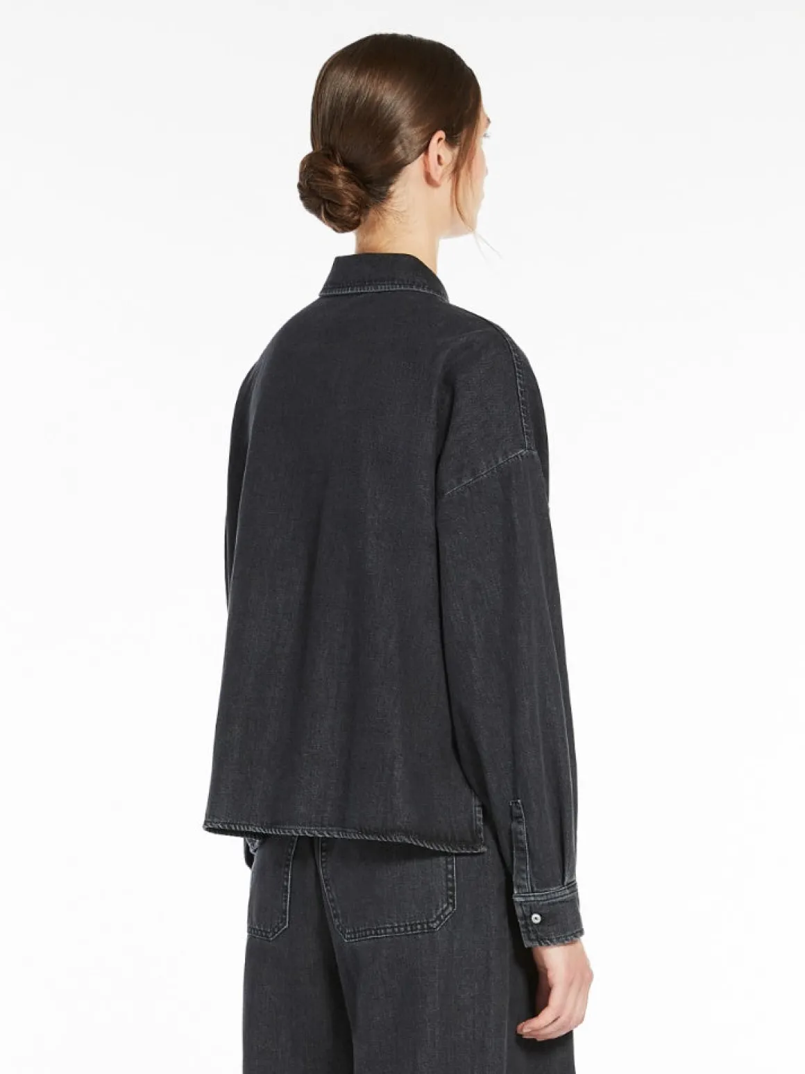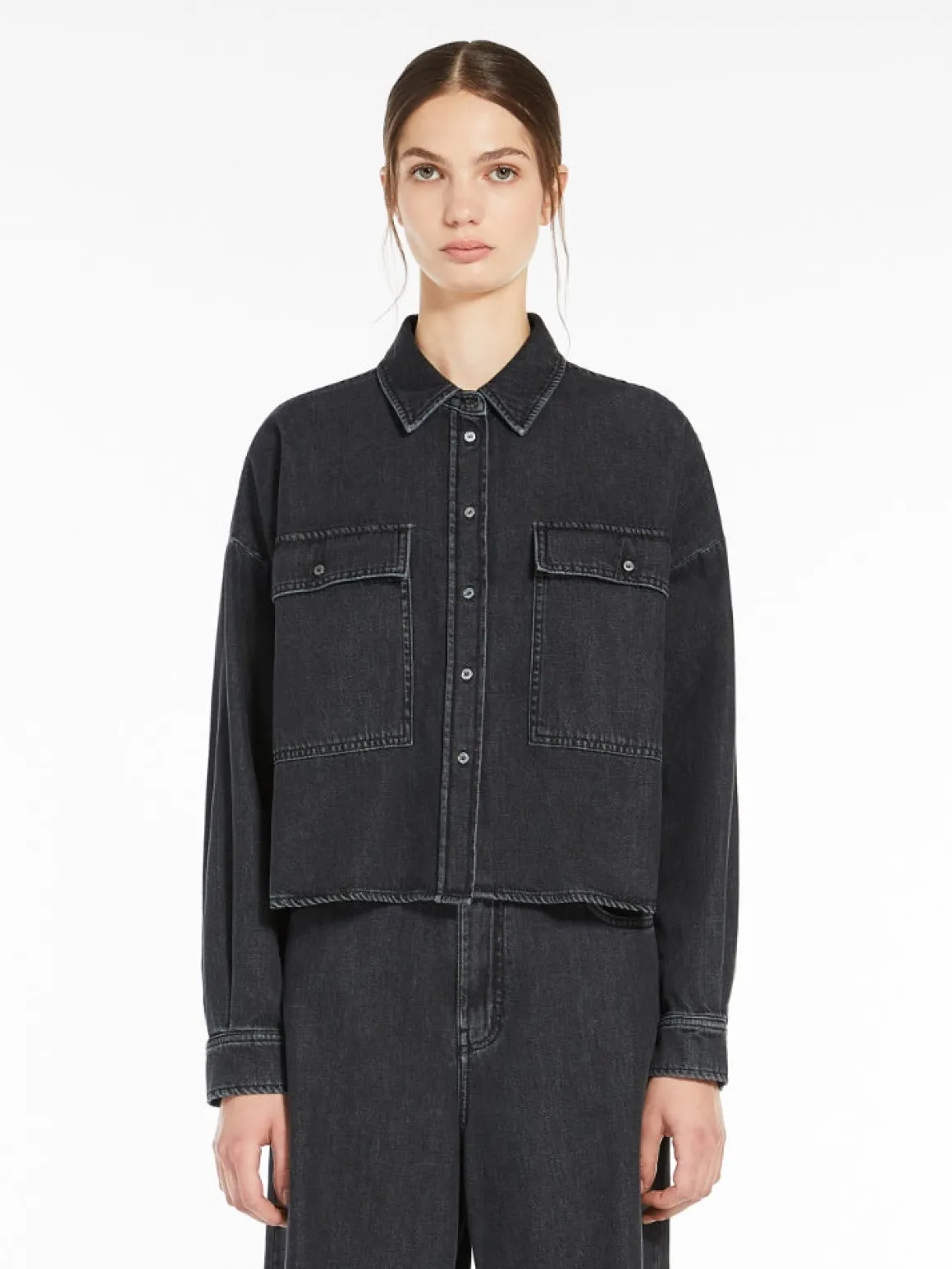 This shirt is made of soft and fluid-hand cotton denim fabric, providing a comfortable and stylish fit. The boxy-fit design features dropped shoulders, a classic collar, and buttoned cuff-embellished long sleeves. It also has buttoned flap-adorned large patch breast pockets, side slits, and a subtle high-low asymmetrical hem. The button fastening adds a touch of convenience to this must-have piece.