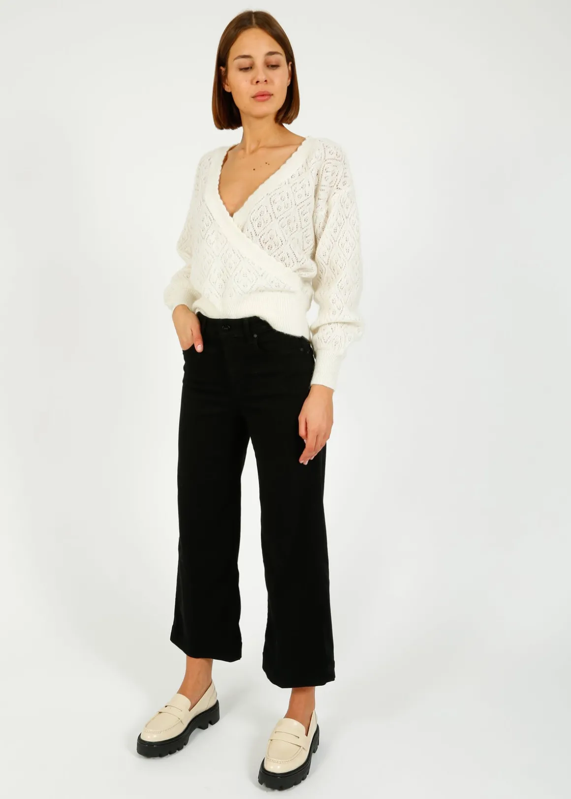 - Regular fit, high rise, wide leg, cropped, structured waistband with belt loops, five pockets, pressed centre creases, branded hardware, brand patch at back waistband, V-shaped yoke at back