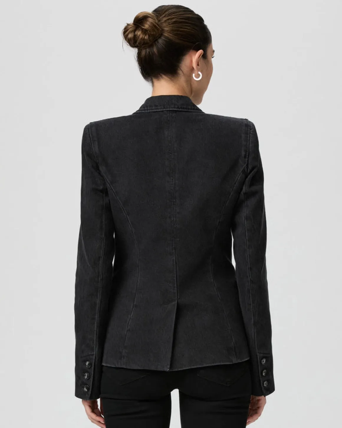 Elevate your denim-on-denim look with the Carmen denim blazer in a vintage-inspired black wash. Made from super-soft denim with a hint of stretch, this stylish blazer features black horn buttons, slimming seam details, a notched lapel, a centre back vent, and flap pockets. Add a touch of sophistication to your outfit with this must-have piece.