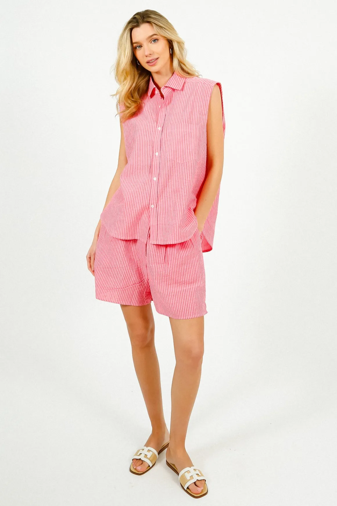This PARK Resort Sleeveless Shirt in Pink and Red Stripe is perfect for any sunny day adventure! Made of 100% cotton with a classic collar and pinstripe print, this shirt offers both style and comfort. Pair it with your favorite shorts and sandals for a chic and effortless look.
