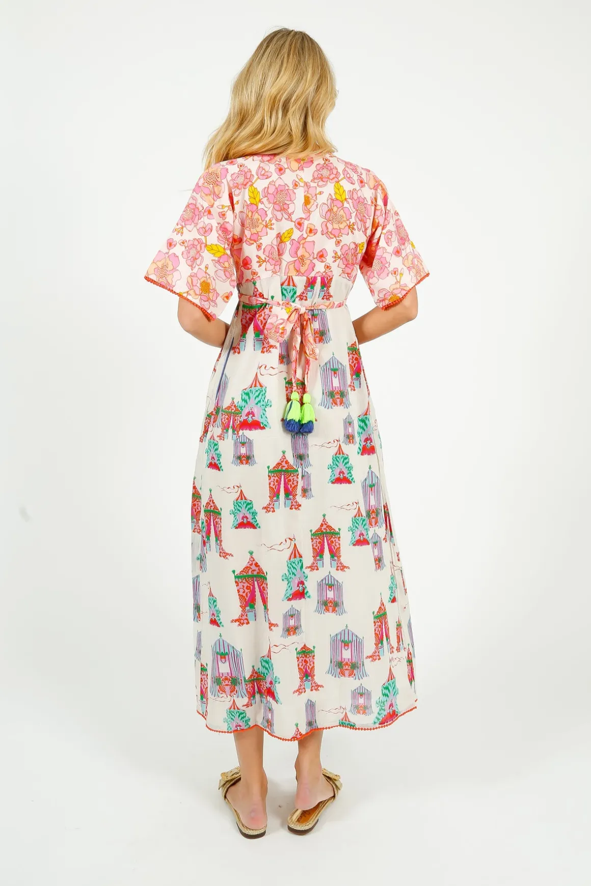Get noticed in this stunning long dress from PDS 443! The mix of vibrant blue, green, pink, and orange in the floral top and tea tents patterned skirt will make you stand out. With a v-neck, short sleeves, and a tie detail that can be worn at the front or back, this maxi is perfect for summer. Add it to your holiday wardrobe for a lightweight and stylish option.