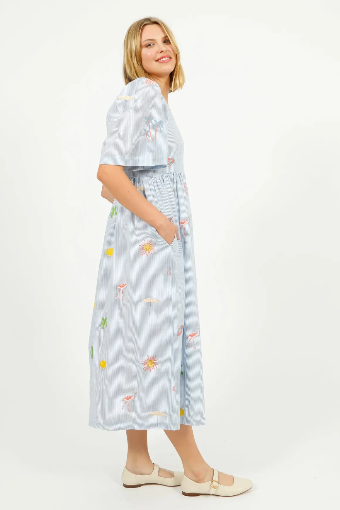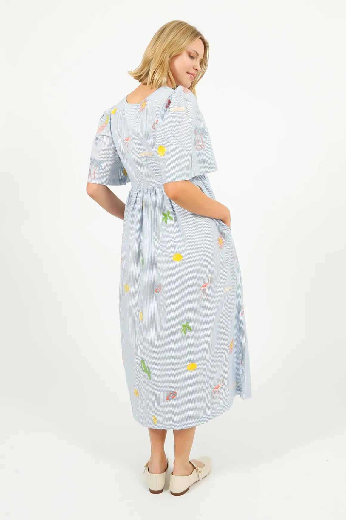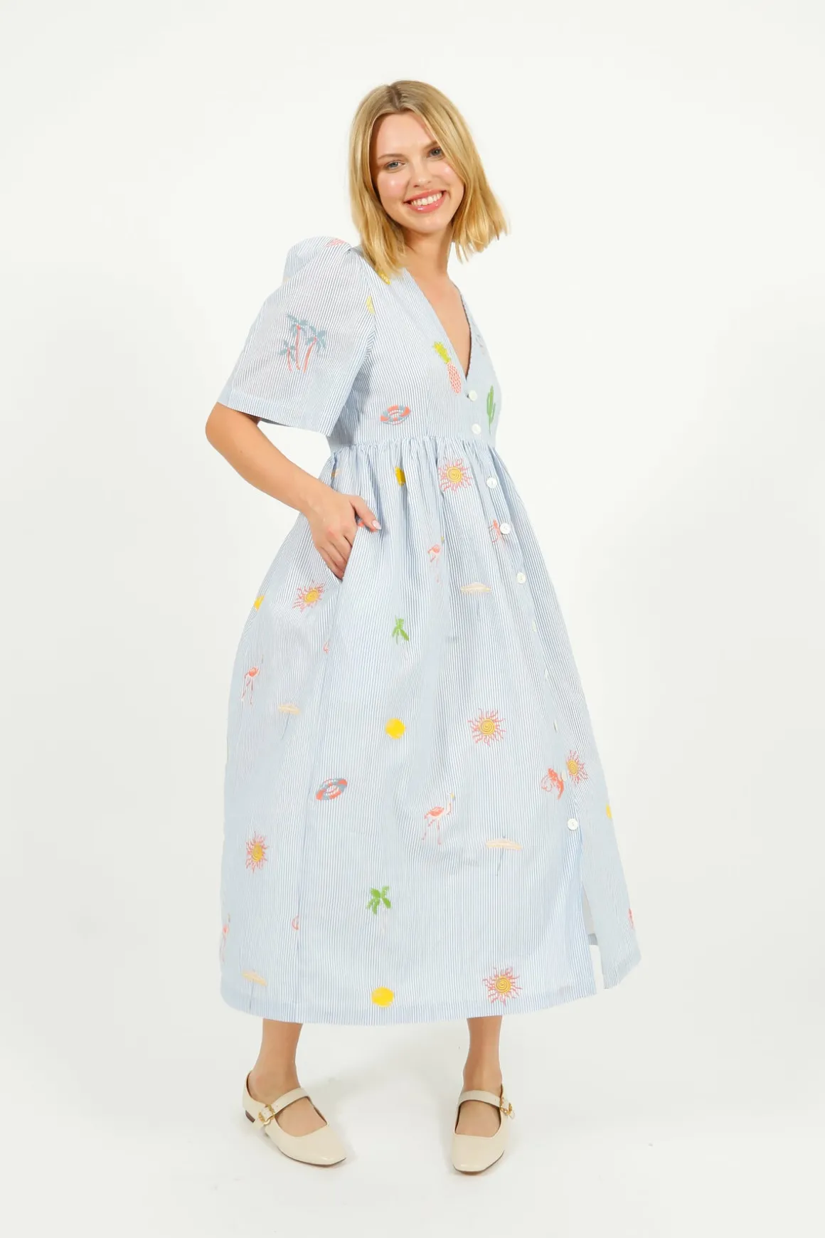 A classic summer silhouette with a modern twist, this blue striped cotton dress is adorned with vibrant Palm Springs-inspired embroidery. The fitted bodice, featuring a flattering V-neck and pretty mother-of-pearl buttons, flows into a softly gathered maxi skirt for effortless movement. Full short sleeves enhance its breezy elegance, making it an ideal choice for sun-soaked days. Just add sandals and you’re ready to go.