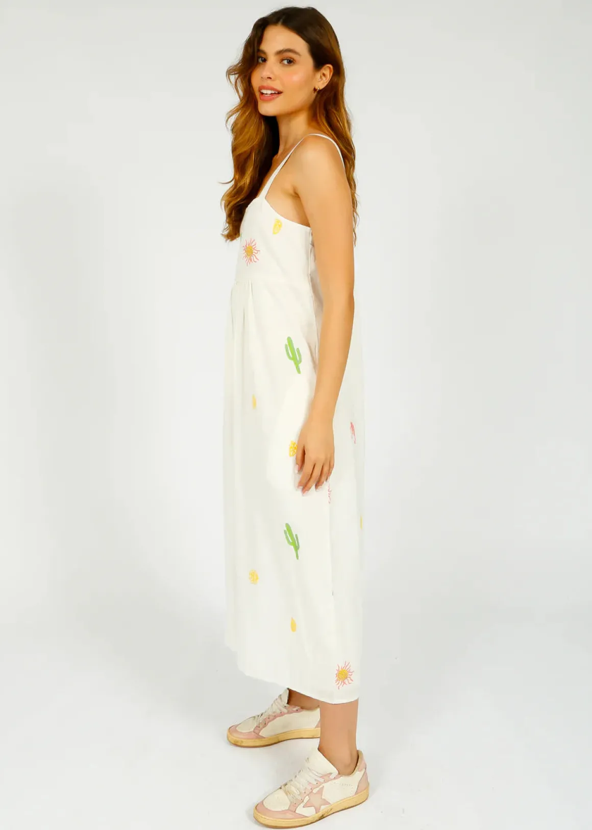 A timeless warm-weather staple, this white cotton/linen dress is accented with playful Palm Springs embroidery for a touch of whimsy. The flattering silhouette features a fitted bust that flows into a sweeping maxi skirt, creating an effortlessly feminine shape. Lightweight and versatile, it’s perfect for sun-drenched city days or breezy afternoons by the beach. Wear it with sandals for an easy, elegant look or style it with trainers for a relaxed, modern edge.