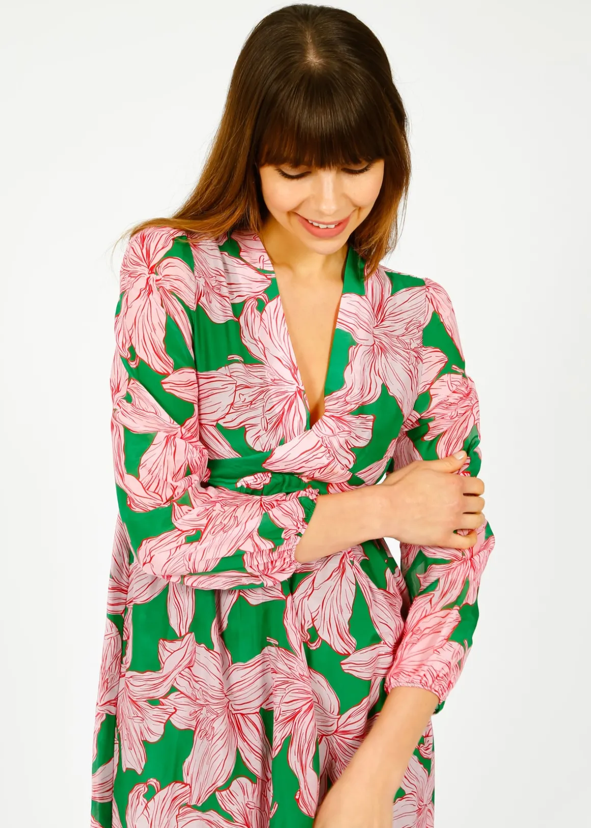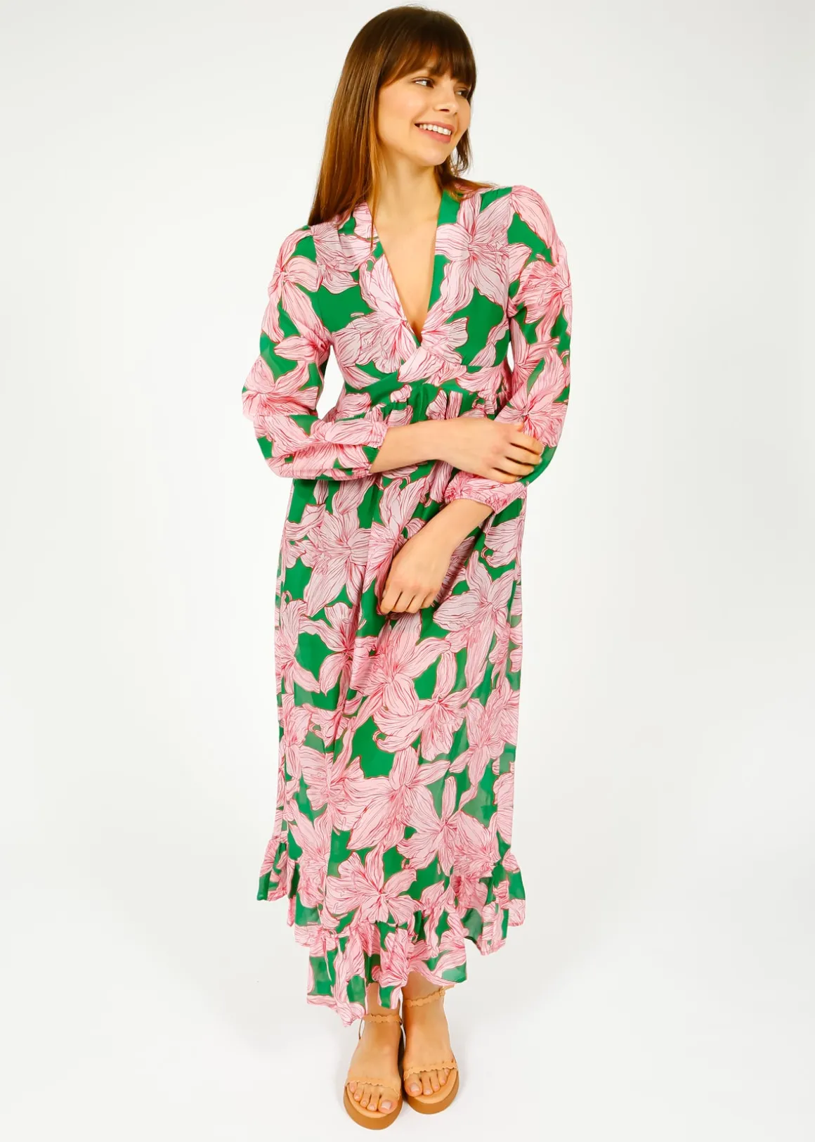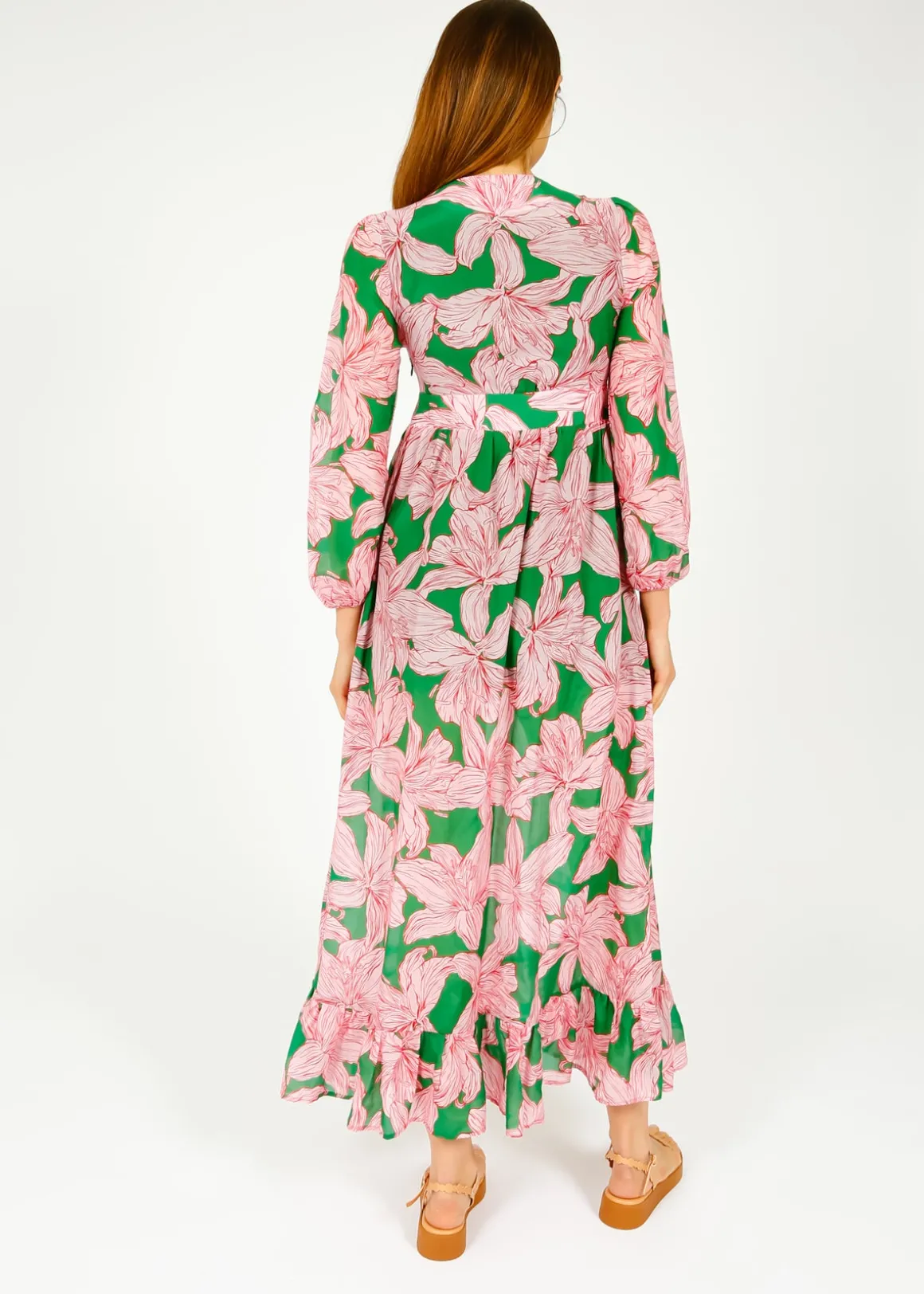 Indulge in a touch of elegance with our PPL Daisy Dress in Lily 01 Pink and Green. Made from a luxurious blend of 70% cotton and 30% silk, this maxi dress features a V-neckline and adorable puff sleeves. The tiered hem and zip fastening add a modern touch, while the stunning pink and green floral print adds a touch of whimsy. Perfect for any occasion, this dress is sure to make you feel confident and beautiful.