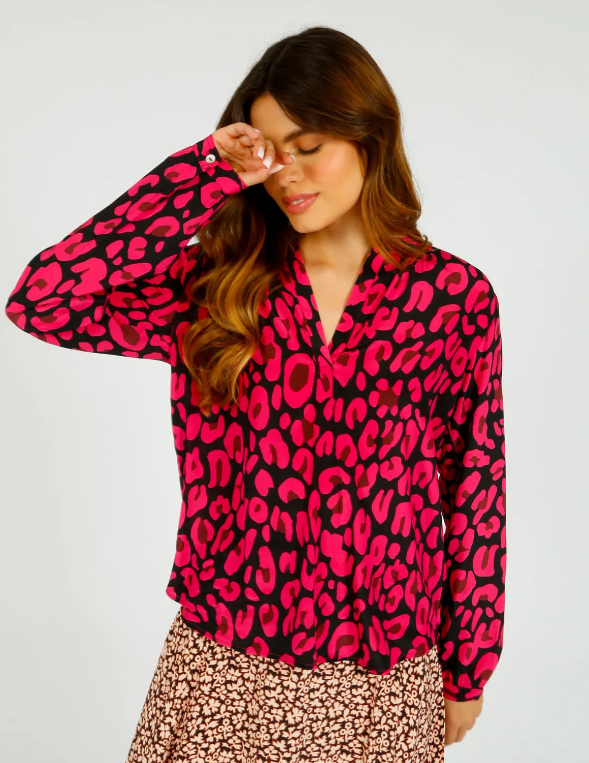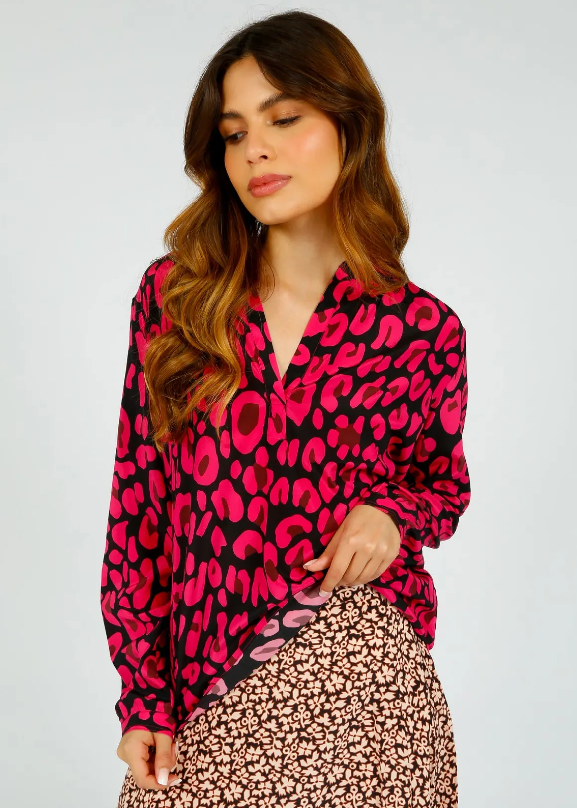 Unleash your wild side with our PPL Sandy Silk Shirt! Made of 100% viscose for ultimate comfort, this shirt features a v-neckline and long sleeves. The high-low hem showcases a bold and playful brown and green leopard print, adding the perfect touch of fierce to any outfit.