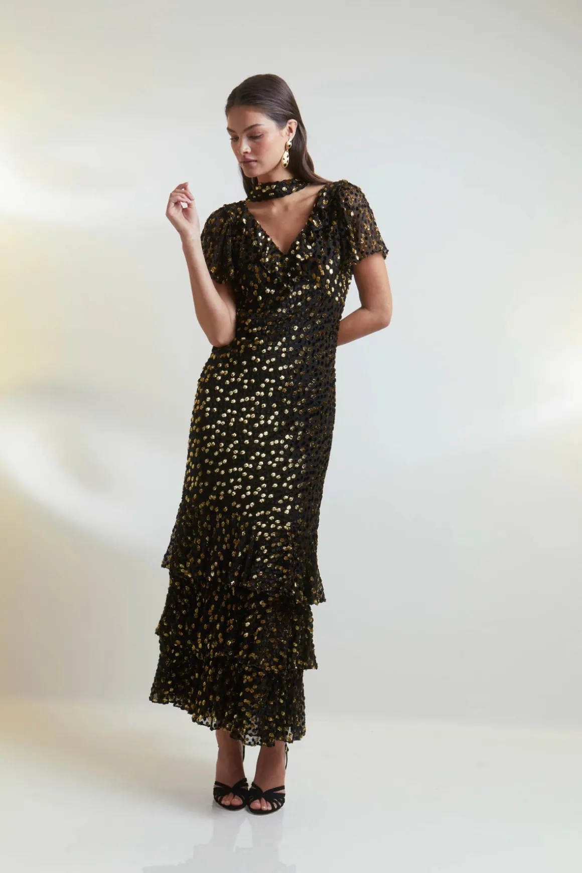 Dazzle in the RIXO Amelle Dress, made with a stunning blend of polyamide, viscose, and metallic fibers. Its V-neckline and ruffle details add elegance, while the tiered maxi skirt and concealed zip fastening make it perfect for events. Feel confident and stylish in this must-have dress!