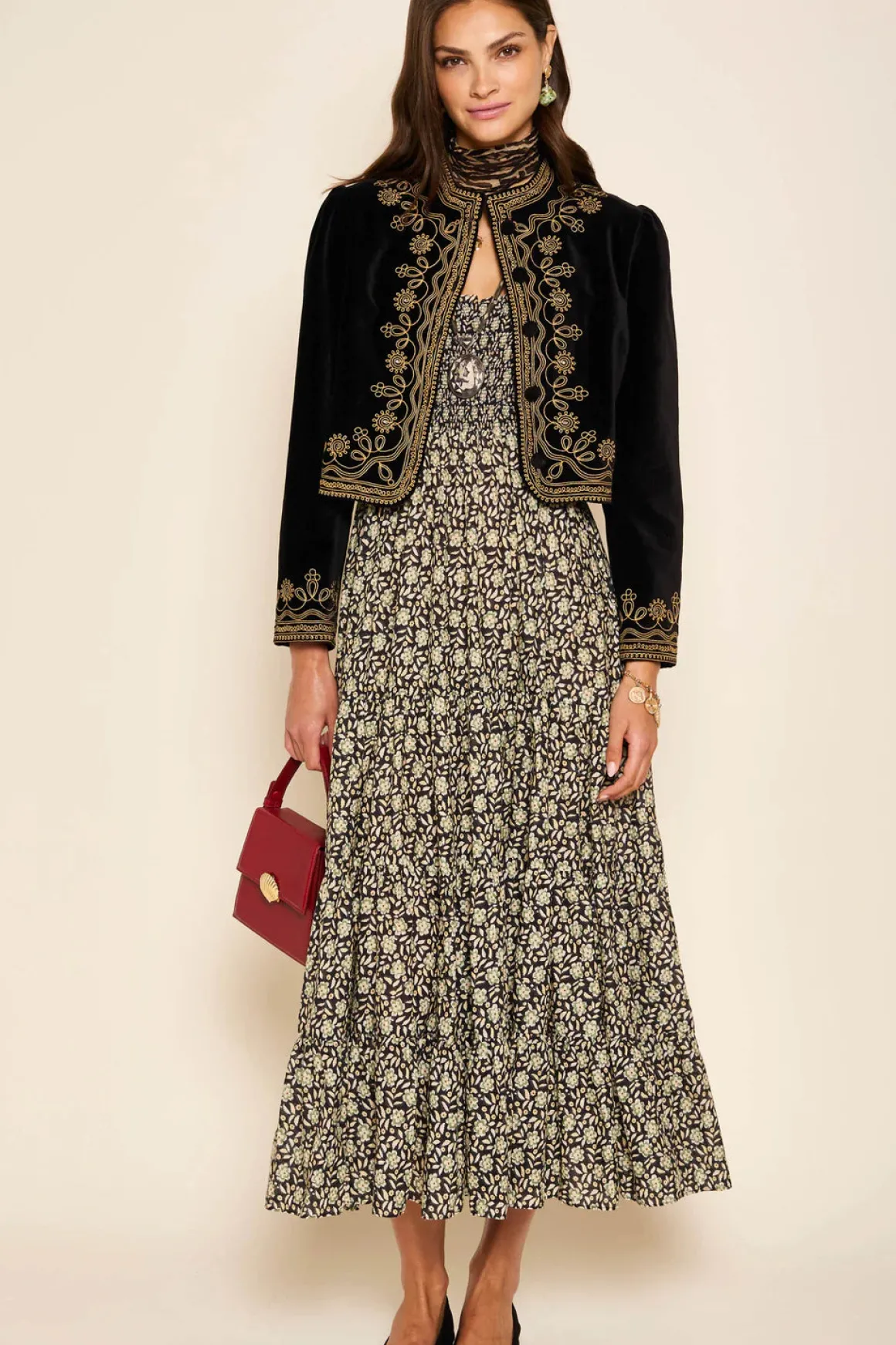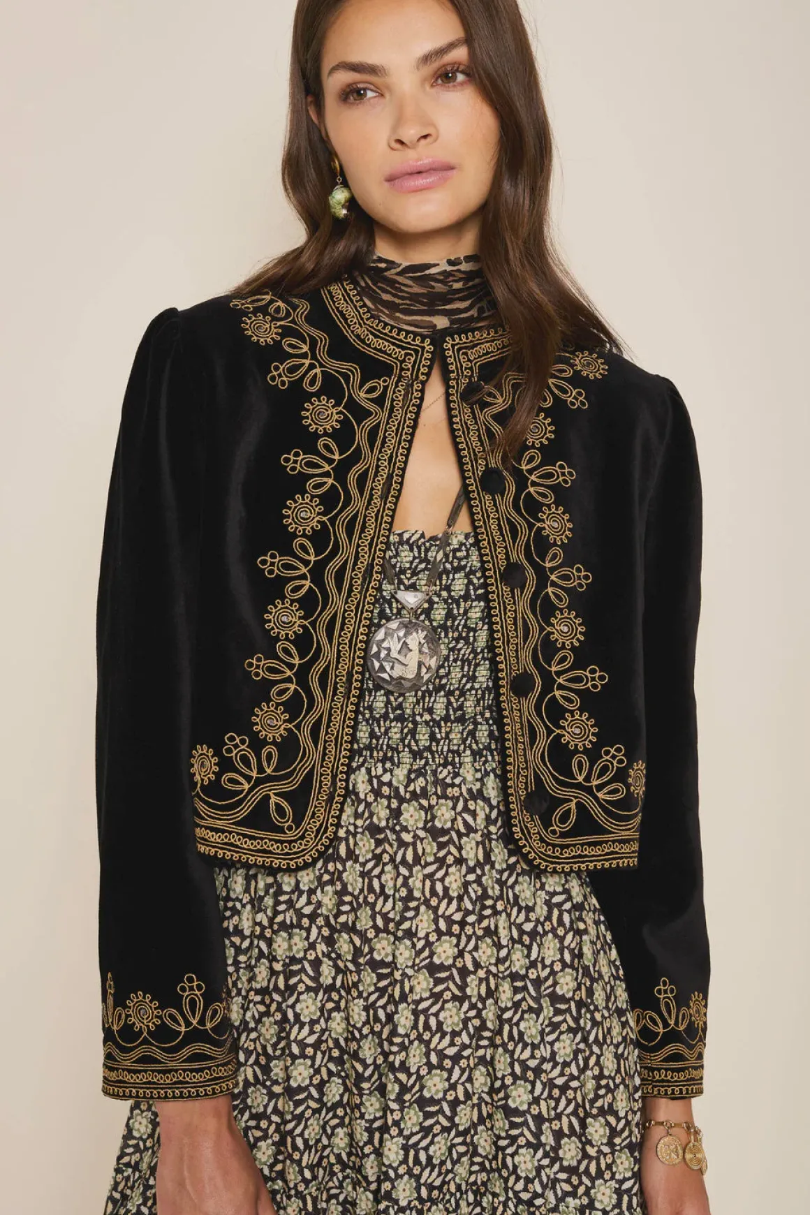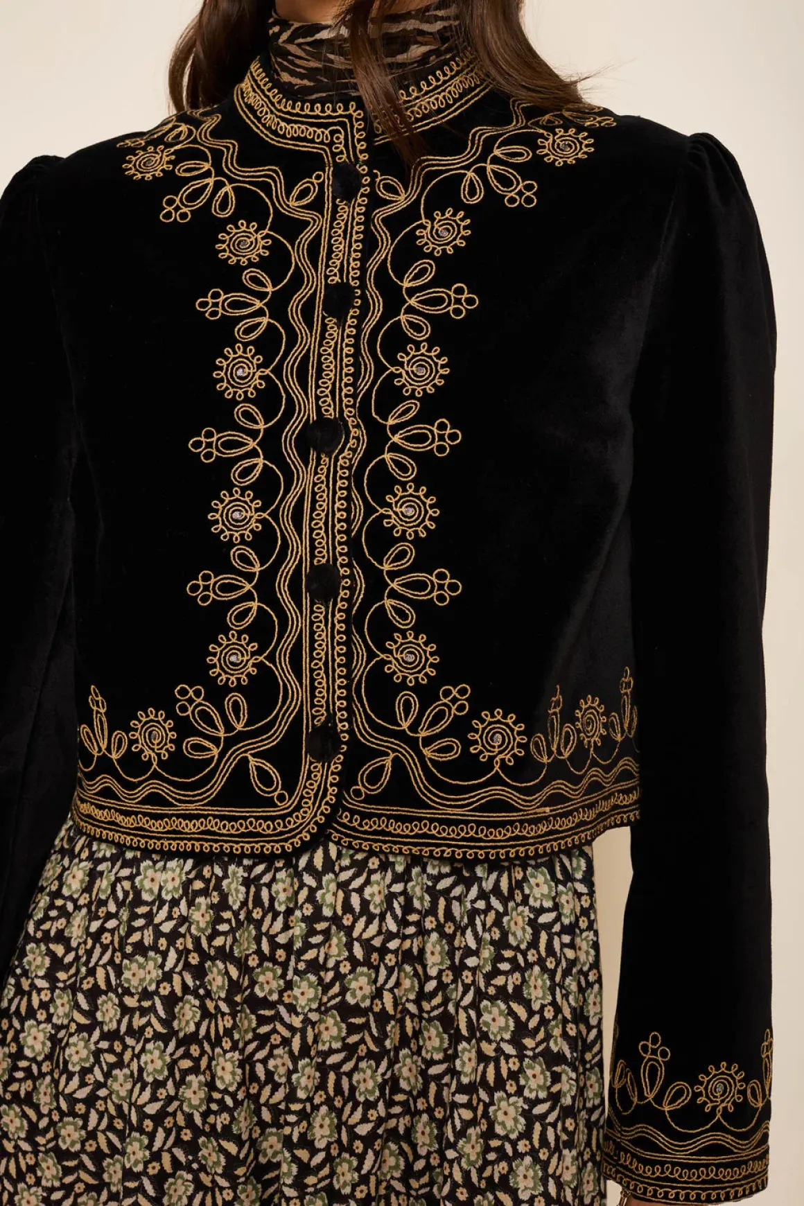 Denver is made from rich black cotton-velvet, perfect for elevating your dresses. The intricate gold soutache embroidery was designed by hand.