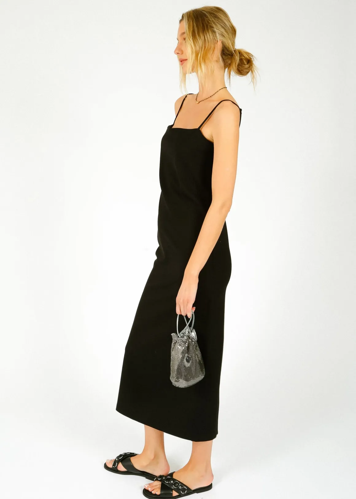Elevate your style with the Ru0026amp;B Irina Cami Maxi Dress in Black! Made with a blend of viscose, polyamide, and elastane, this slim-fitting dress hugs your curves in all the right places. Its spaghetti straps add a touch of femininity, making it the ultimate little black dress for any occasion.