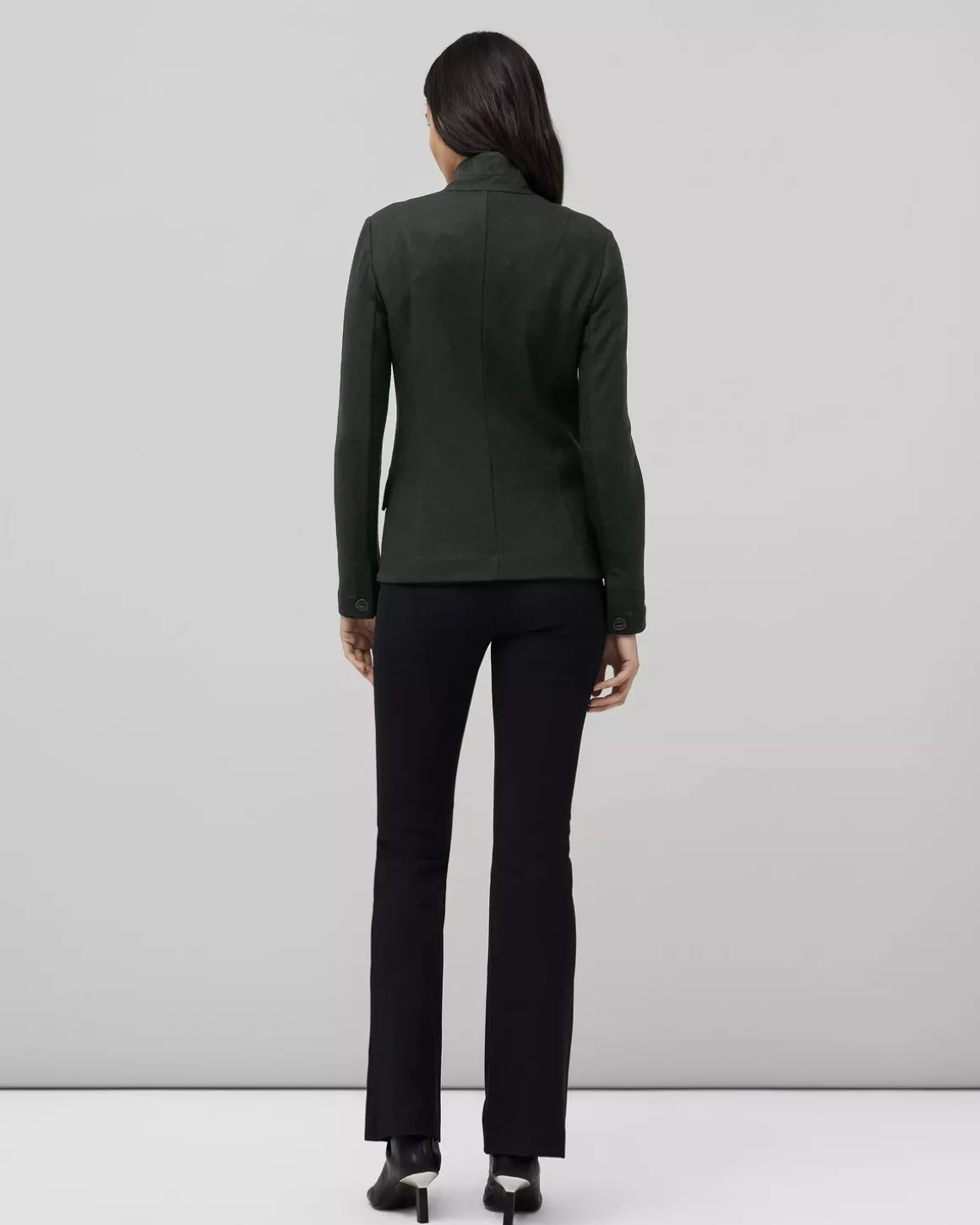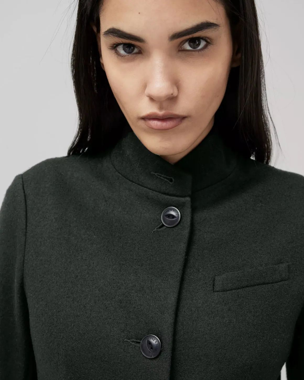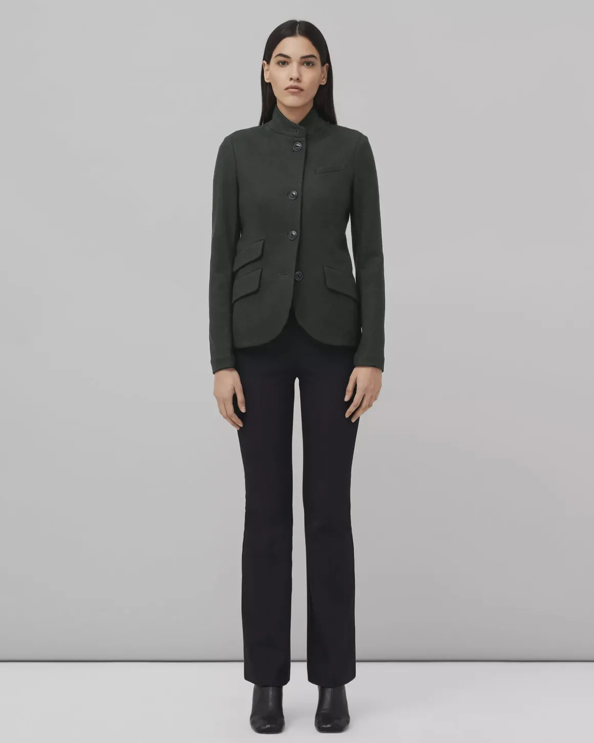 A tailored blazer in our classic wool suiting fabric with stand up collar.