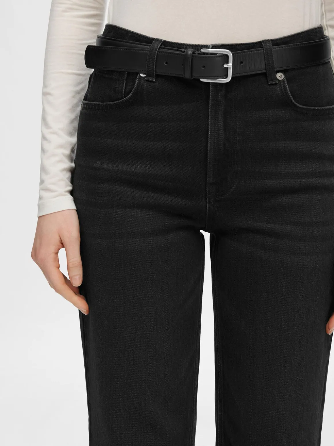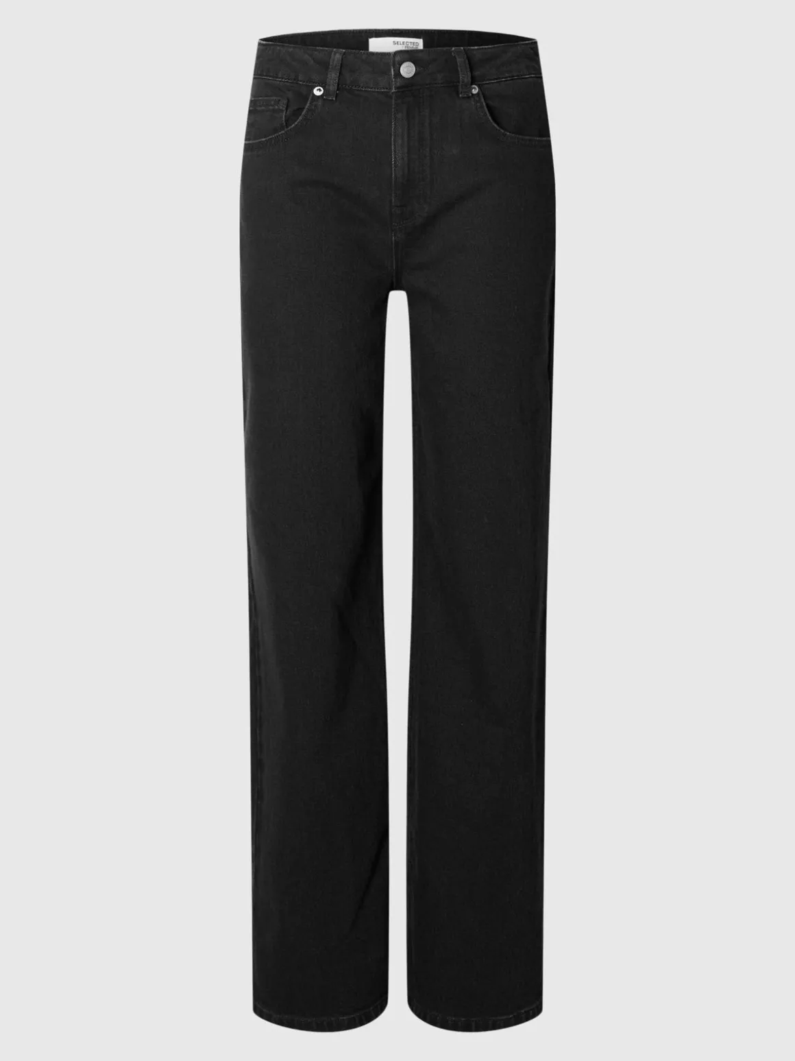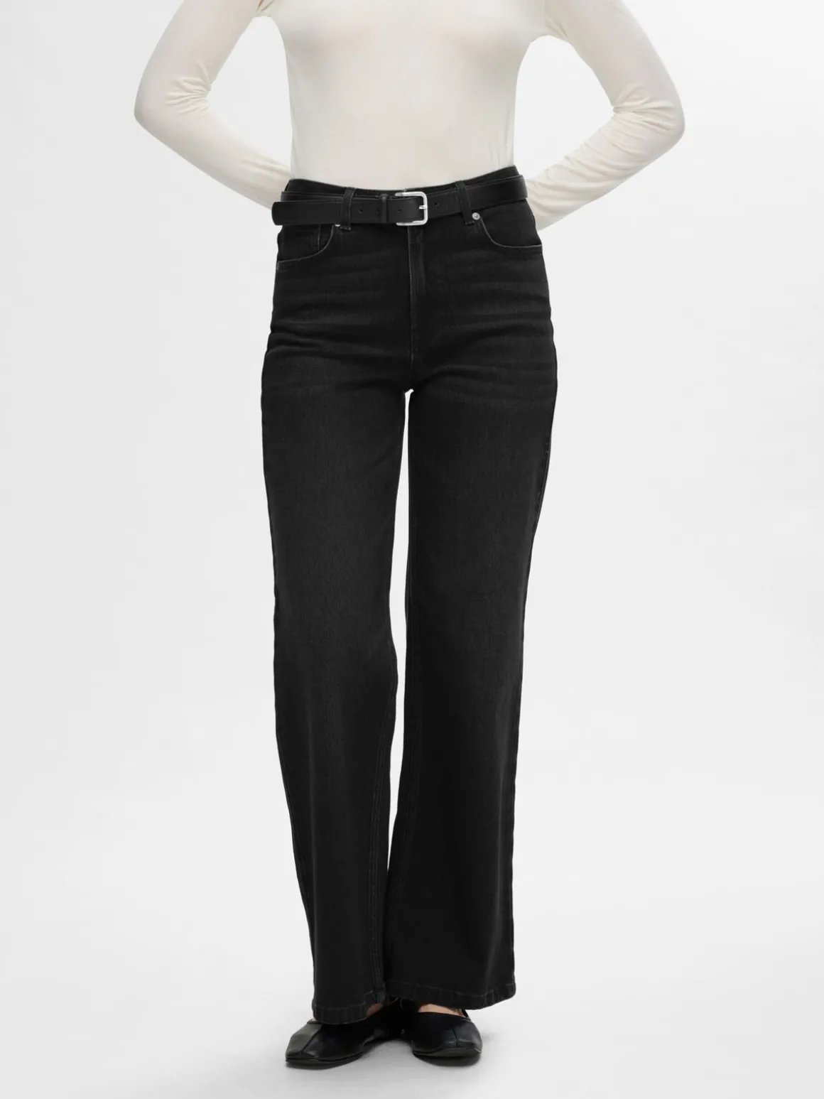 Expand your denim collection with these black wide-leg jeans. They have a flattering high waist and a wider cut from hips to hem, visually elongating your legs and balancing your proportions. These jeans are also made to last, as they’re made from lightweight and durable organic cotton, ensuring they keep their shape longer. Wear them with a printed blouse and ballet flats.