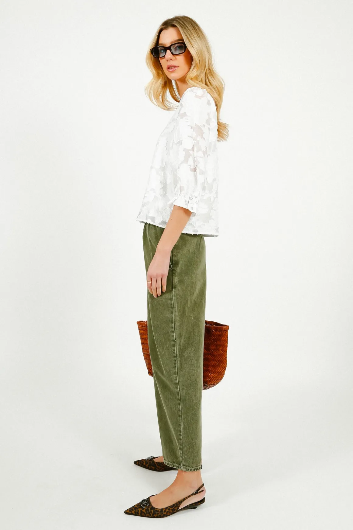 - Boxy fit, v-neck and 3/4 sleeves with a light puff and elastic cuff. The top has a semi-transparent fabric with embroidered details