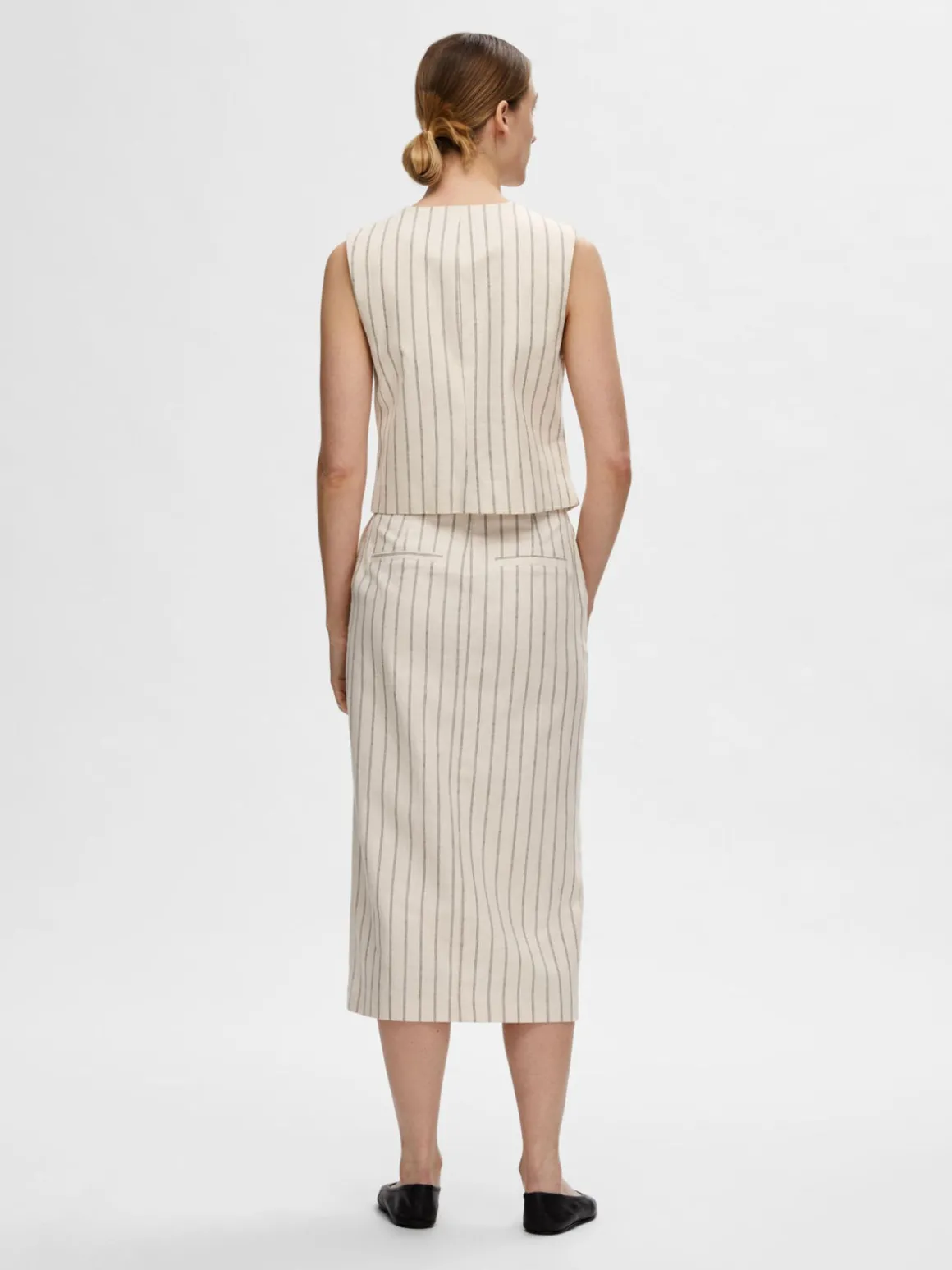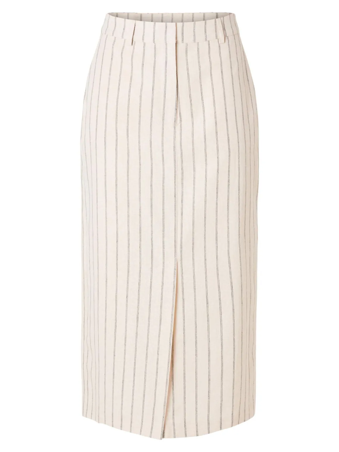 Embrace the sunny season with this pinstripe midi pencil skirt. It has a classic silhouette and a high waist that accentuates your figure and comes in a timeless pinstripe design. It’s made with hemp, which is known for its durable and breathable properties and, combined with cotton, makes for a lightweight option for summer dressing. You can wear this skirt as a co-ord with our matching waistcoat or blazer, but you can also style it with a simple tee and leather sandals.