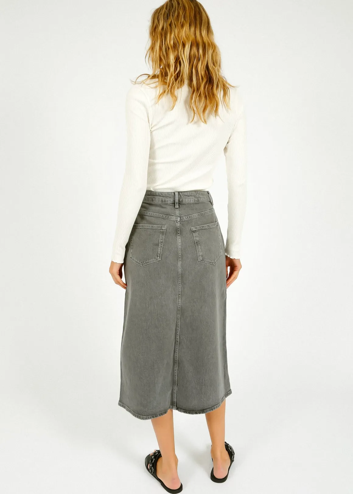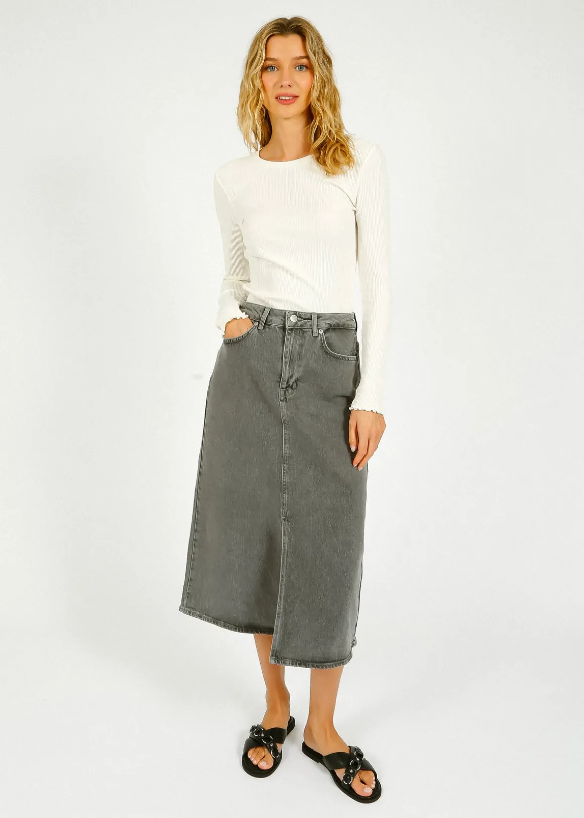 Infuse your wardrobe with timeless style by adding a denim midi skirt. This piece boasts a classic 5-pocket design and a stylish front slit, all in a sophisticated light grey wash. Create a chic look by pairing it with a cute top, sandals, and a leather shoulder bag.