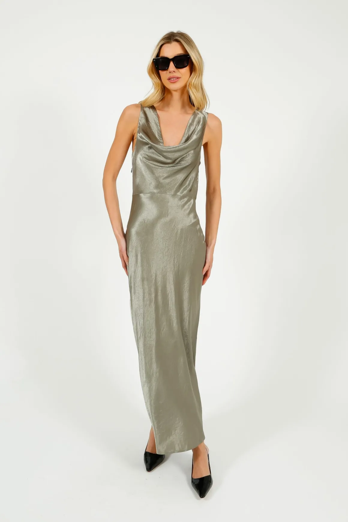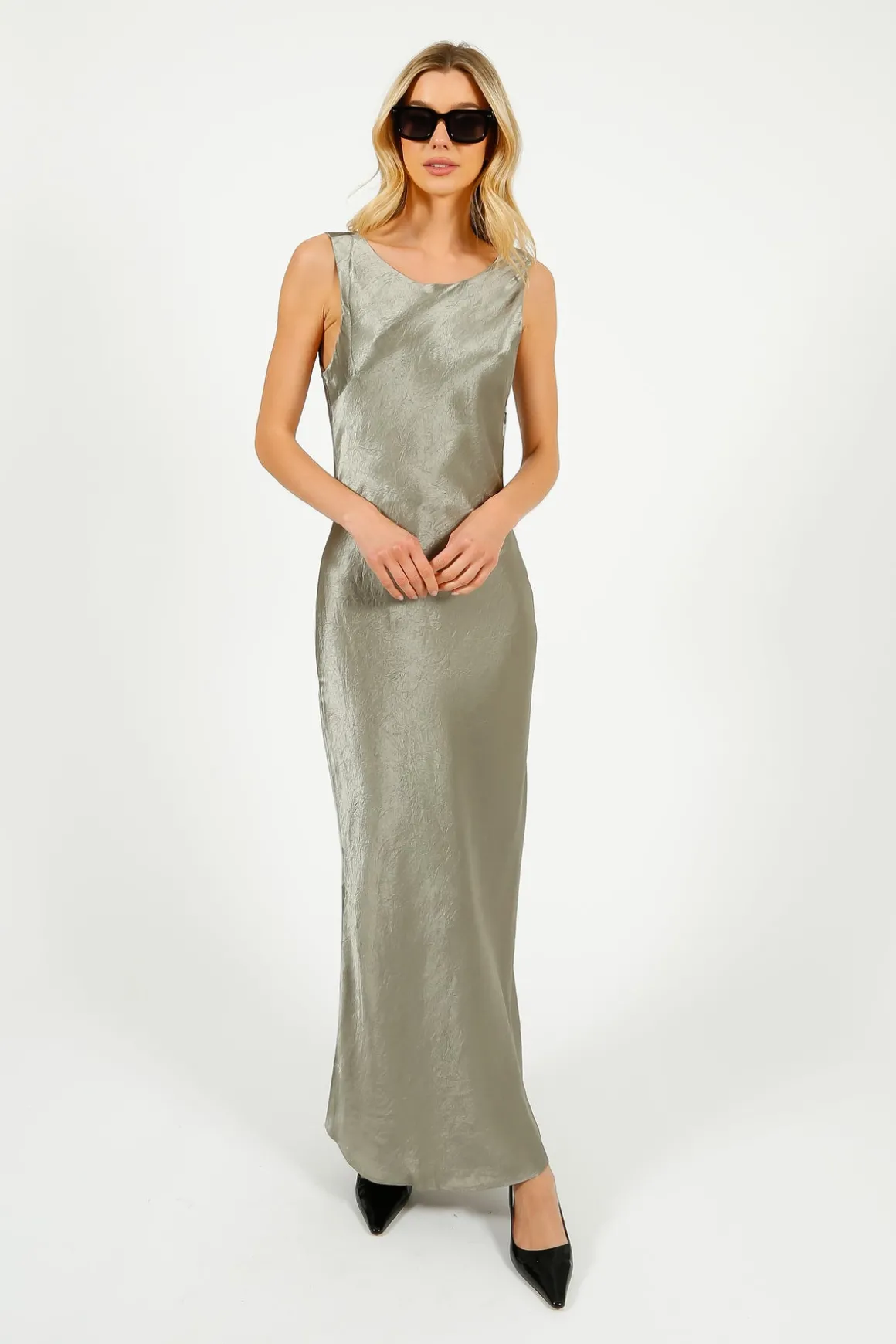 Experience the elegance of timeless minimalism with this stunning midi dress. Crafted from luxurious and silky smooth acetate, it exudes a lustrous shine and unparalleled comfort. Perfect for any special occasion, pair it with sling-back heels, a chic clutch, and statement earrings for a truly glamorous look.