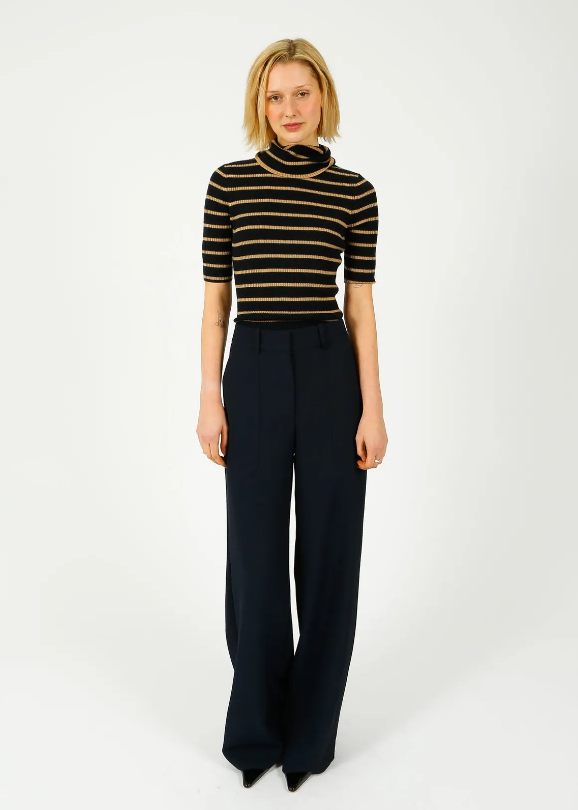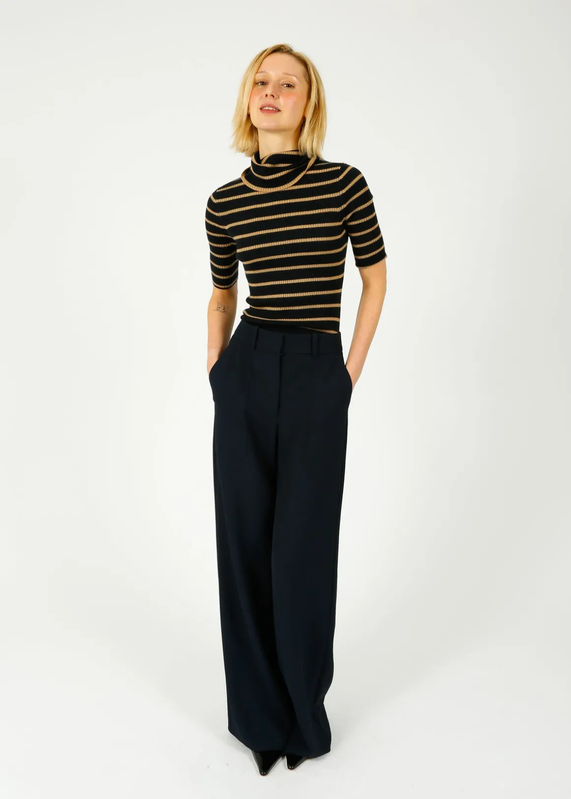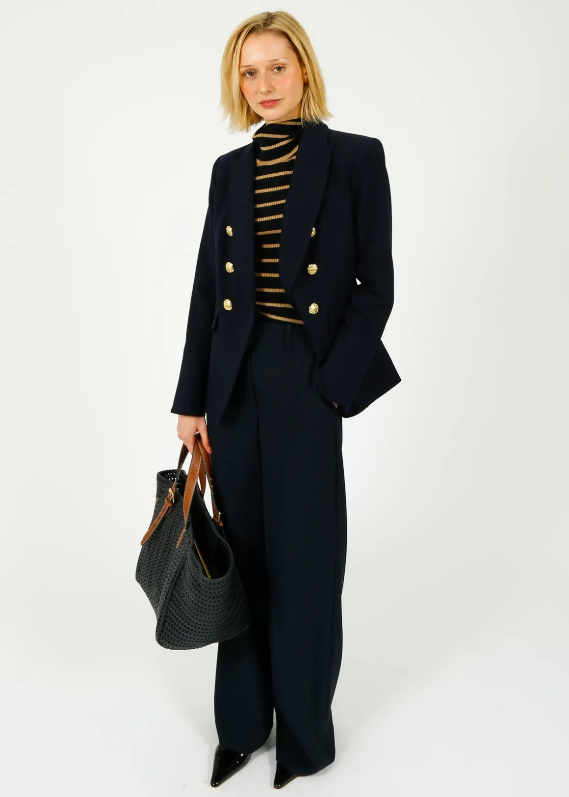 The perfect relaxed pant. Made from a premium stretch blend, the Cole is designed for ease with a wide waistband and a beautifully draped, wide-leg silhouette. Roomy side pockets pockets complete the look. Pair this navy wide-leg with the Colvin top for an effortless matching set.