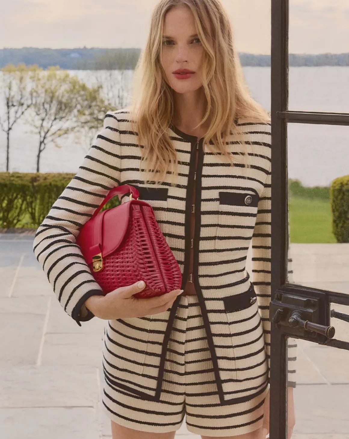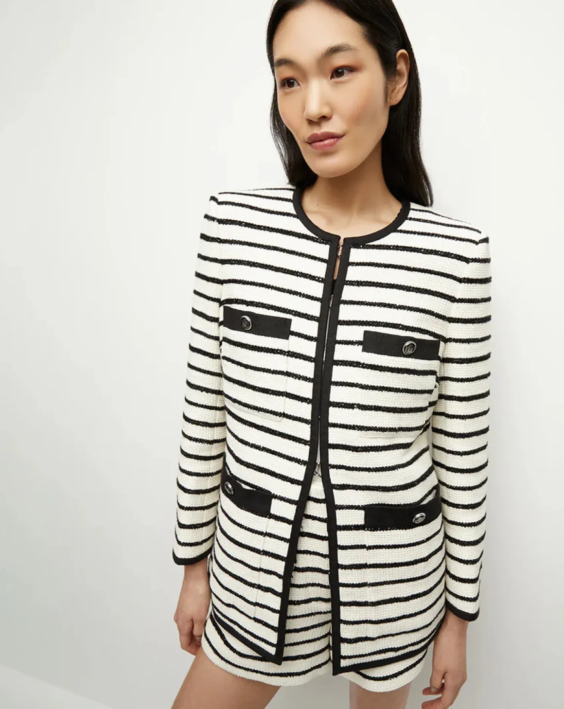 Tailored from an Italian-made textured cotton blend, this collared jacket has an elongated silhouette and a sleek hook-and-eye closure. Four pockets, punctuated with crest buttons, frame the front.