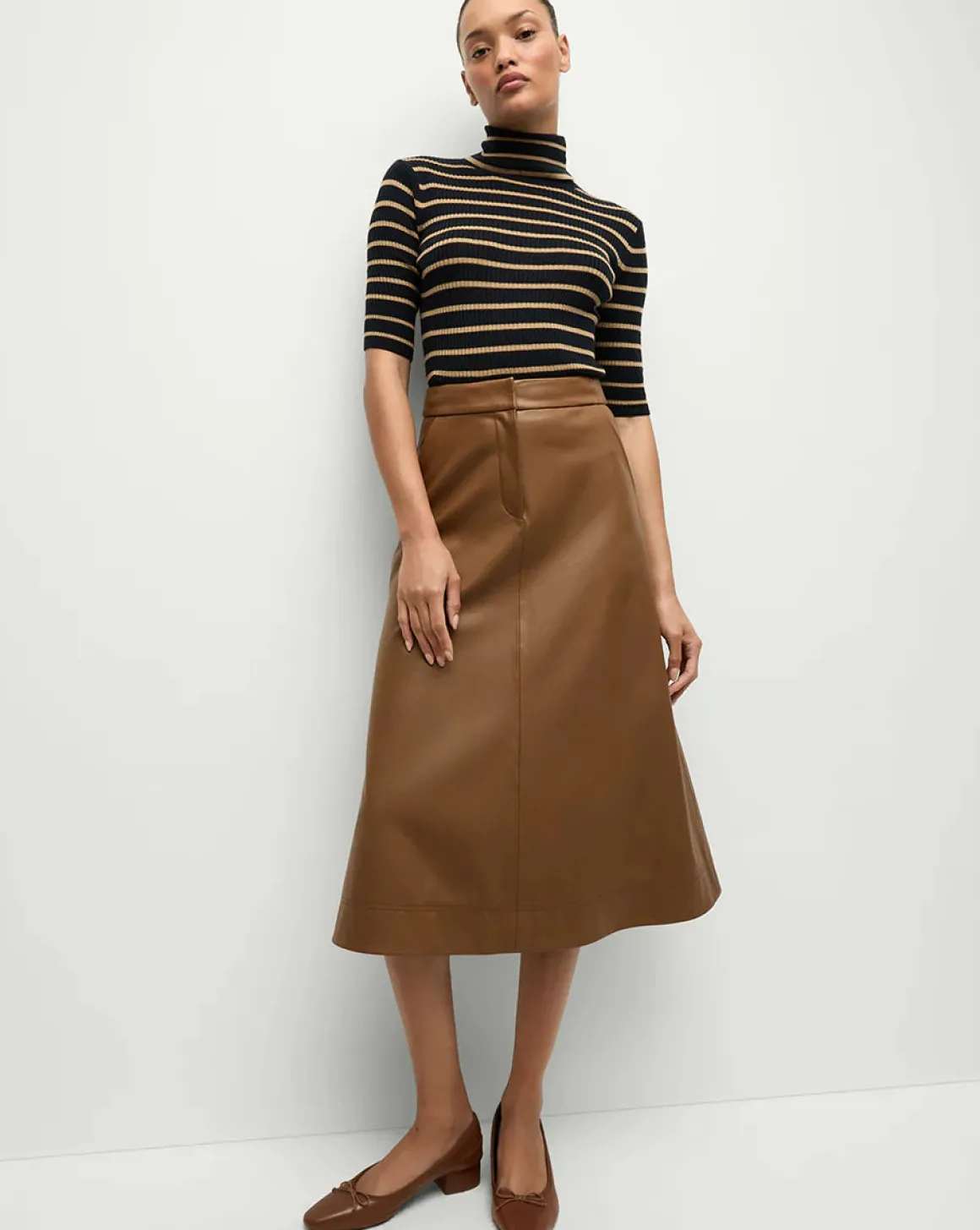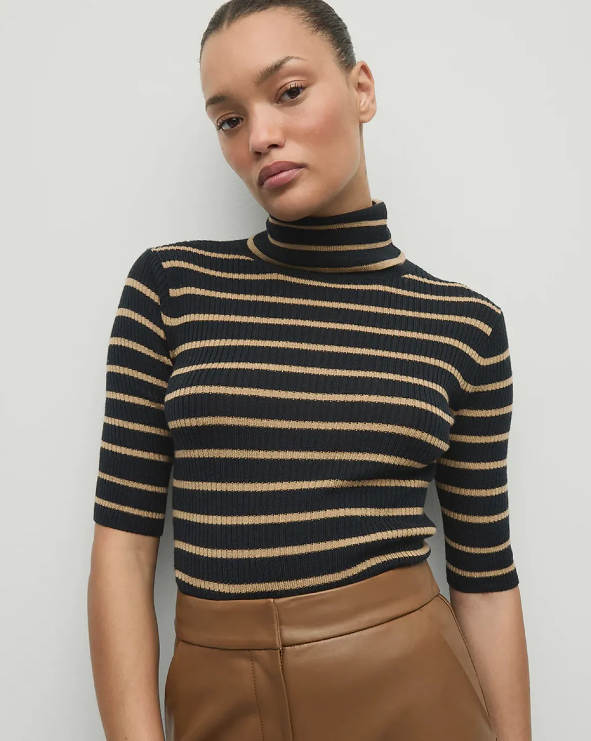 Elevate your wardrobe with the VB Katrina Sweater in Navy, Ivory. Made from 100% merino wool, this turtleneck sweater features a slim fit, stylish horizontal stripes, and ribbed details. Versatile and endlessly chic, it pairs perfectly with jeans, pants, skirts, and more!