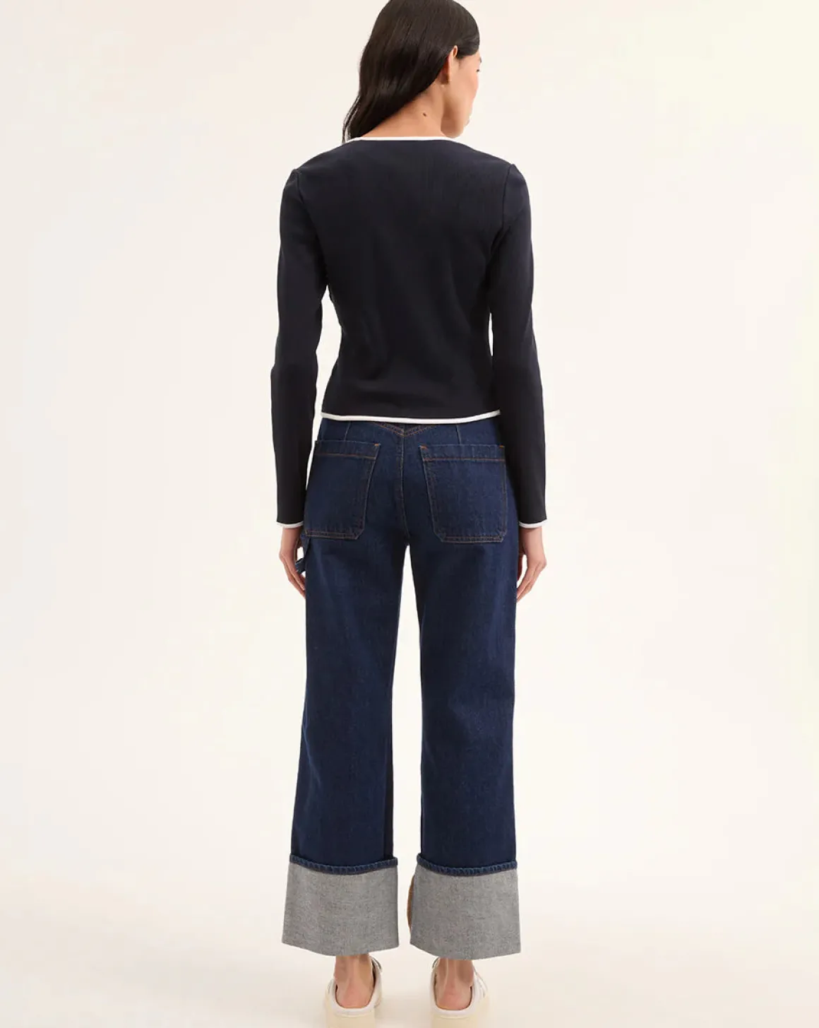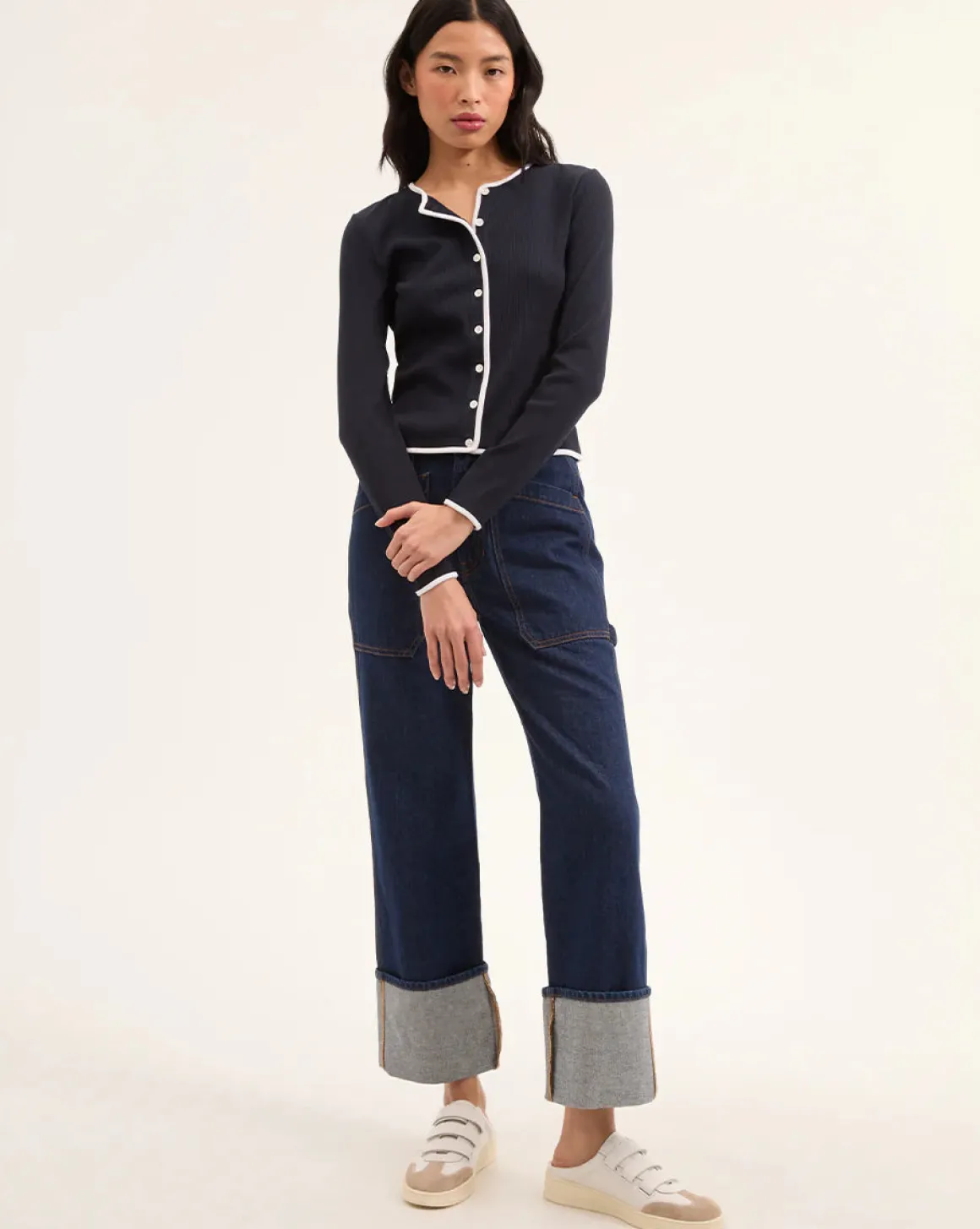 Indulge in the ultimate cardigan for any woman. Crafted from luxurious stretch cotton, the Wilmer boasts a sleek, tailored shape and a cropped, boxy cut. Bold contrast piping injects a touch of dynamic flair. This versatile navy cardigan stands out on its own or as an essential layering piece, making it a year-round necessity.