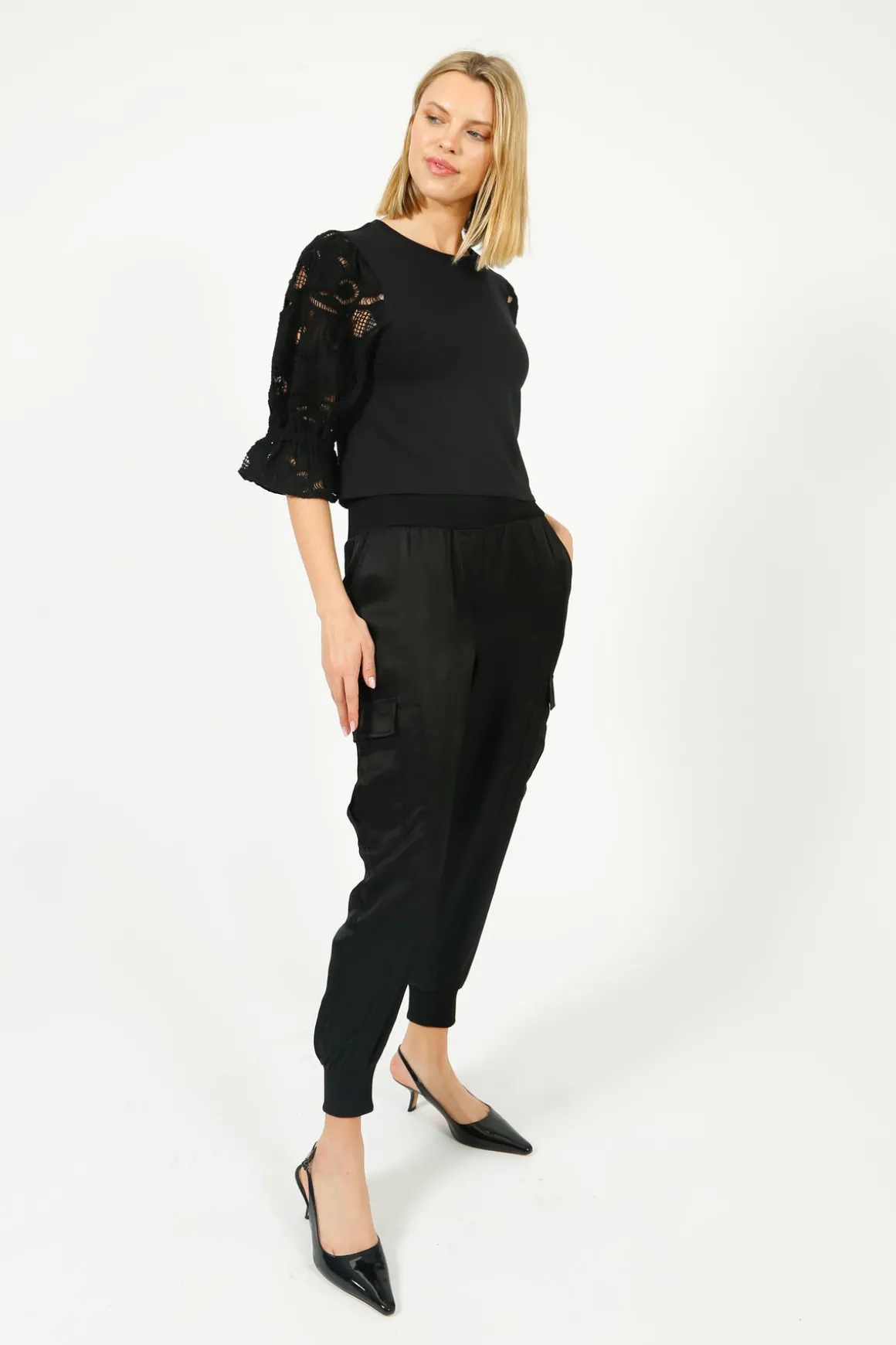 - Elasticized at the waist and ankles