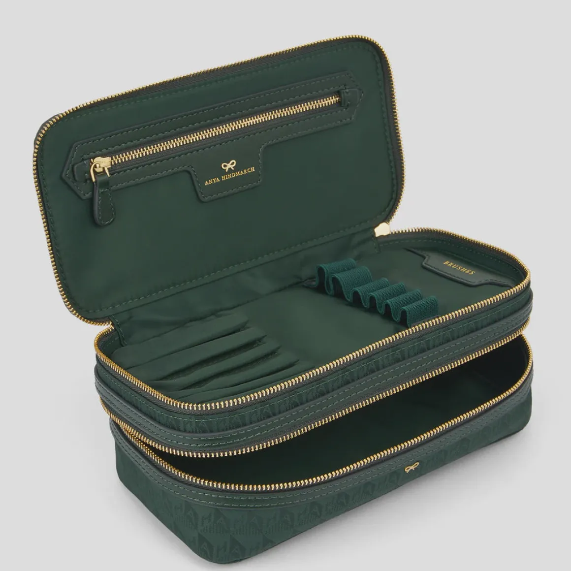 - Internal features: Zipped compartment with zip pull, BRUSHES embossing, elastic band for 6 brushes