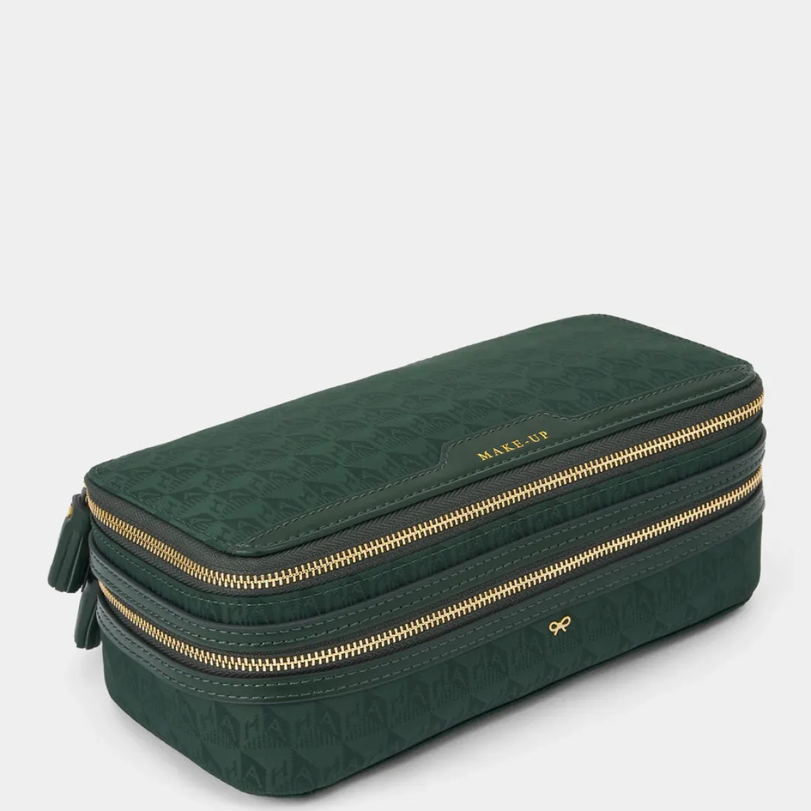 - External features: Leather trims, MAKE-UP embossed label, signature Anya Hindmarch bow, leather tassel zip pulls