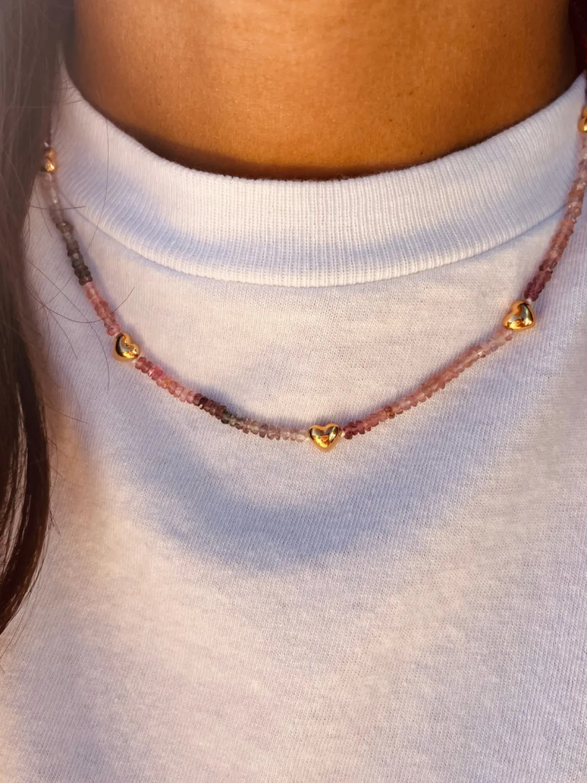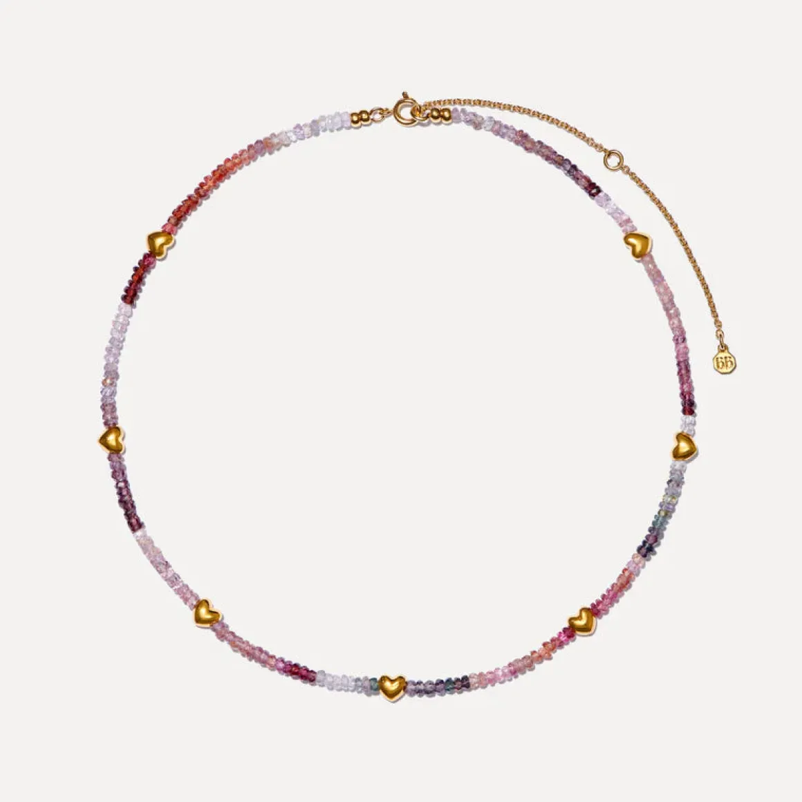 This Mixed Spinel Necklace has been delicately hand crafted and hand finished with 14ct Gold Vermeil hearts.