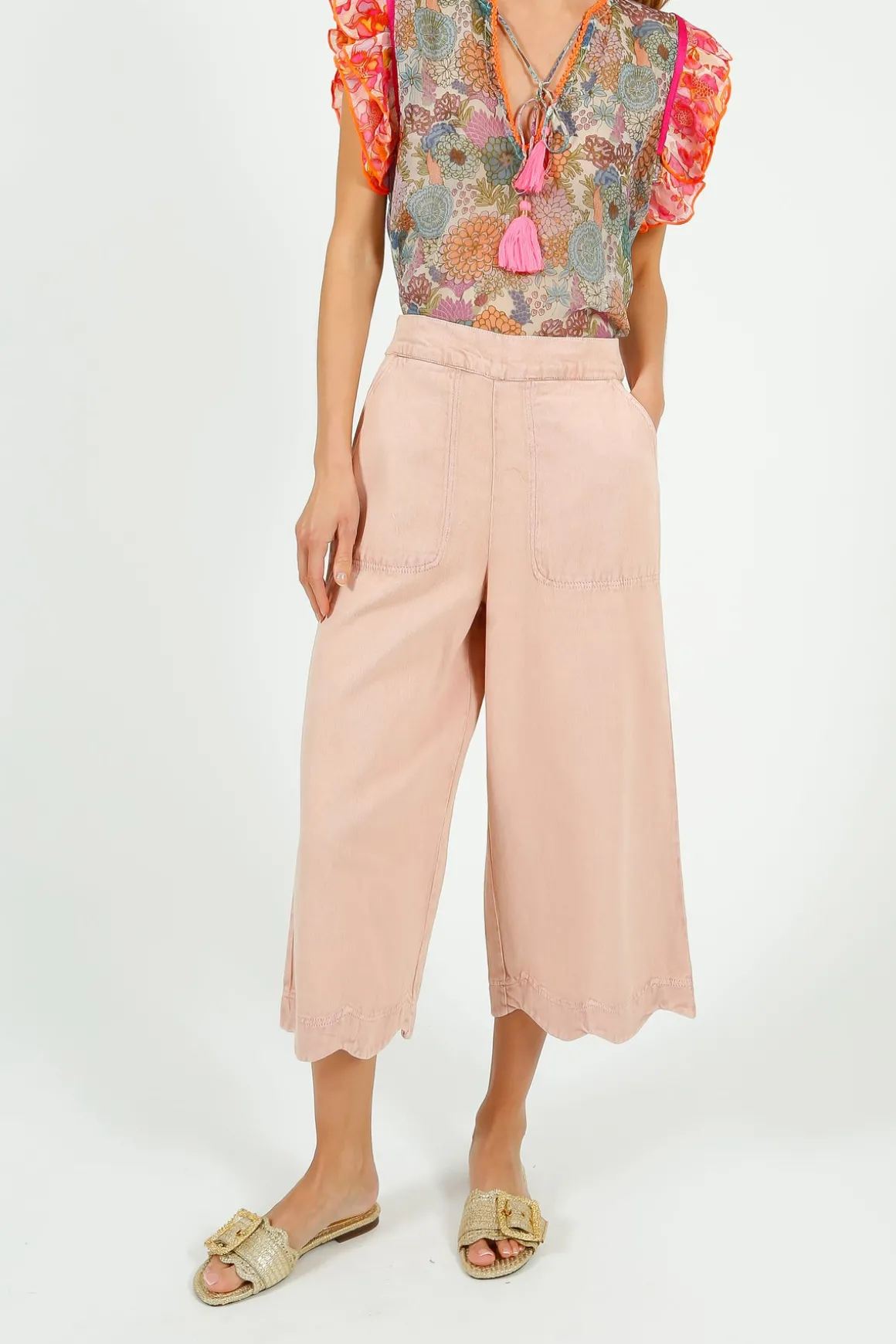 Indulge in the comfort and style of these organic cotton denim trousers. Designed with a relaxed fit and wide leg, these 3/4 length trousers feature a feminine scallop hem detail and an elasticated back for the perfect fit. Complete with stitch-through detailing and tonal twin-needle stitching, these trousers are finished with a charming chalk pink garment wash. Stay effortlessly chic with the convenient side seam pockets.