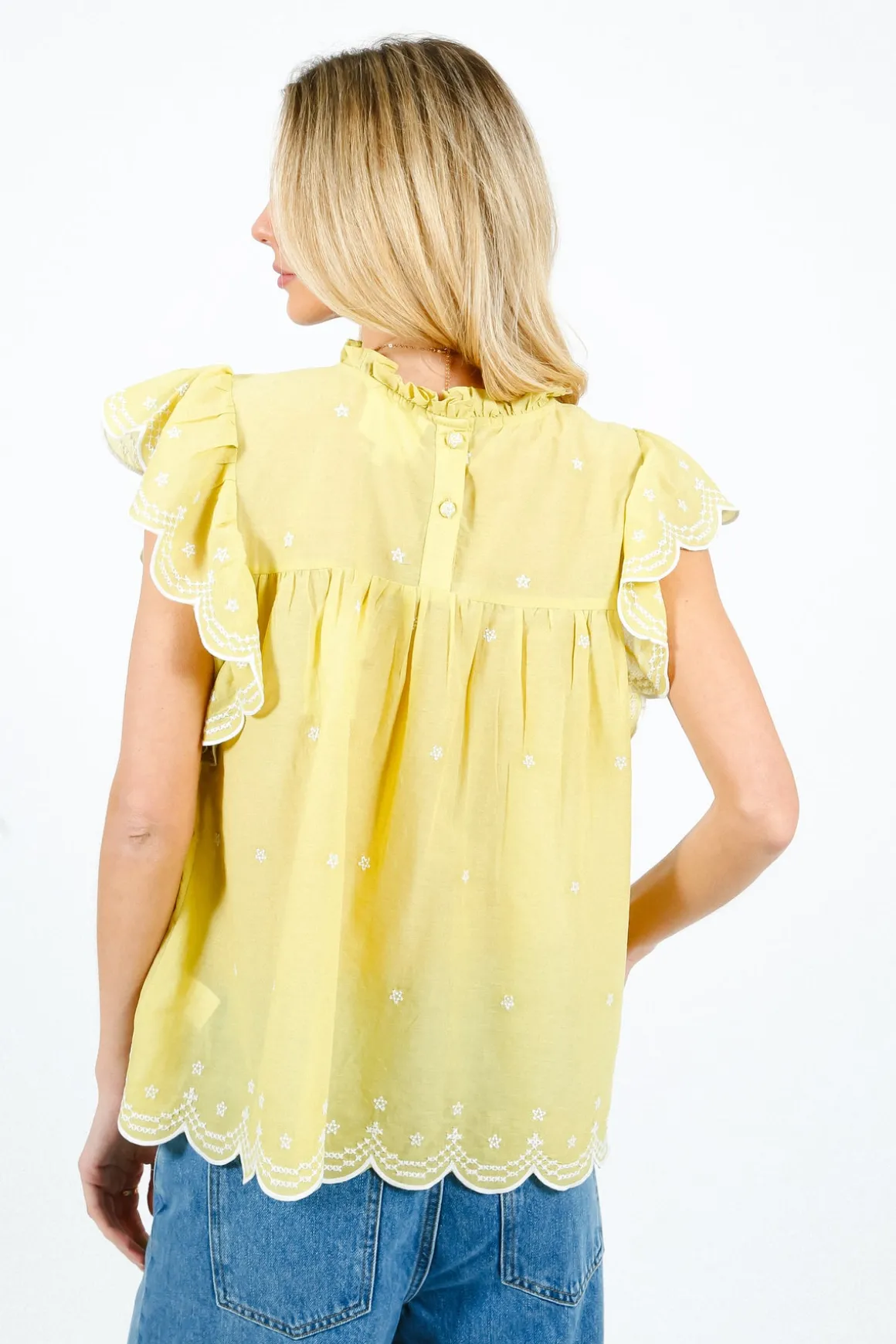 This top is made of a soft, airy cotton voile and features delicate embroidery. The button back opening and cap sleeves add charming details, while the flowing, loose fit creates an effortless and breezy style. The neckline is completed with a small frill, and the hem is embellished with a beautiful border embroidery. Wear this top over other pieces to showcase its stunning design.