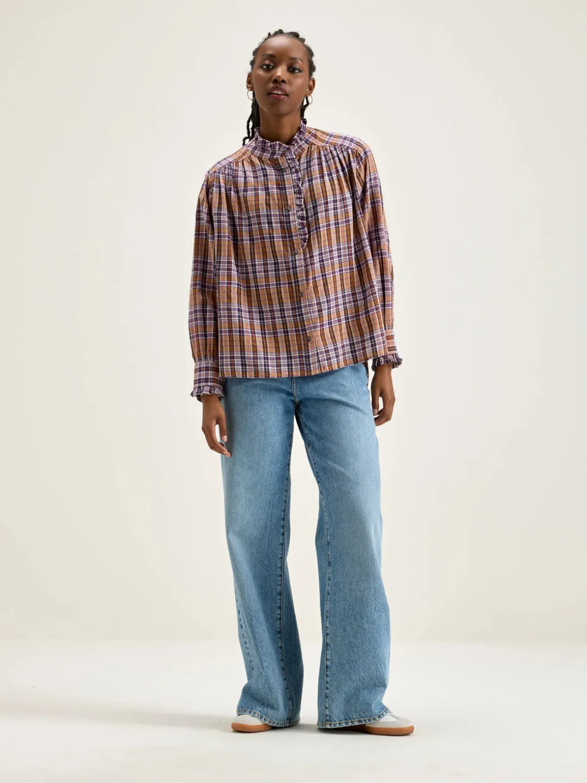 Checkered cotton blouse with gathered pleats and a raised collar.