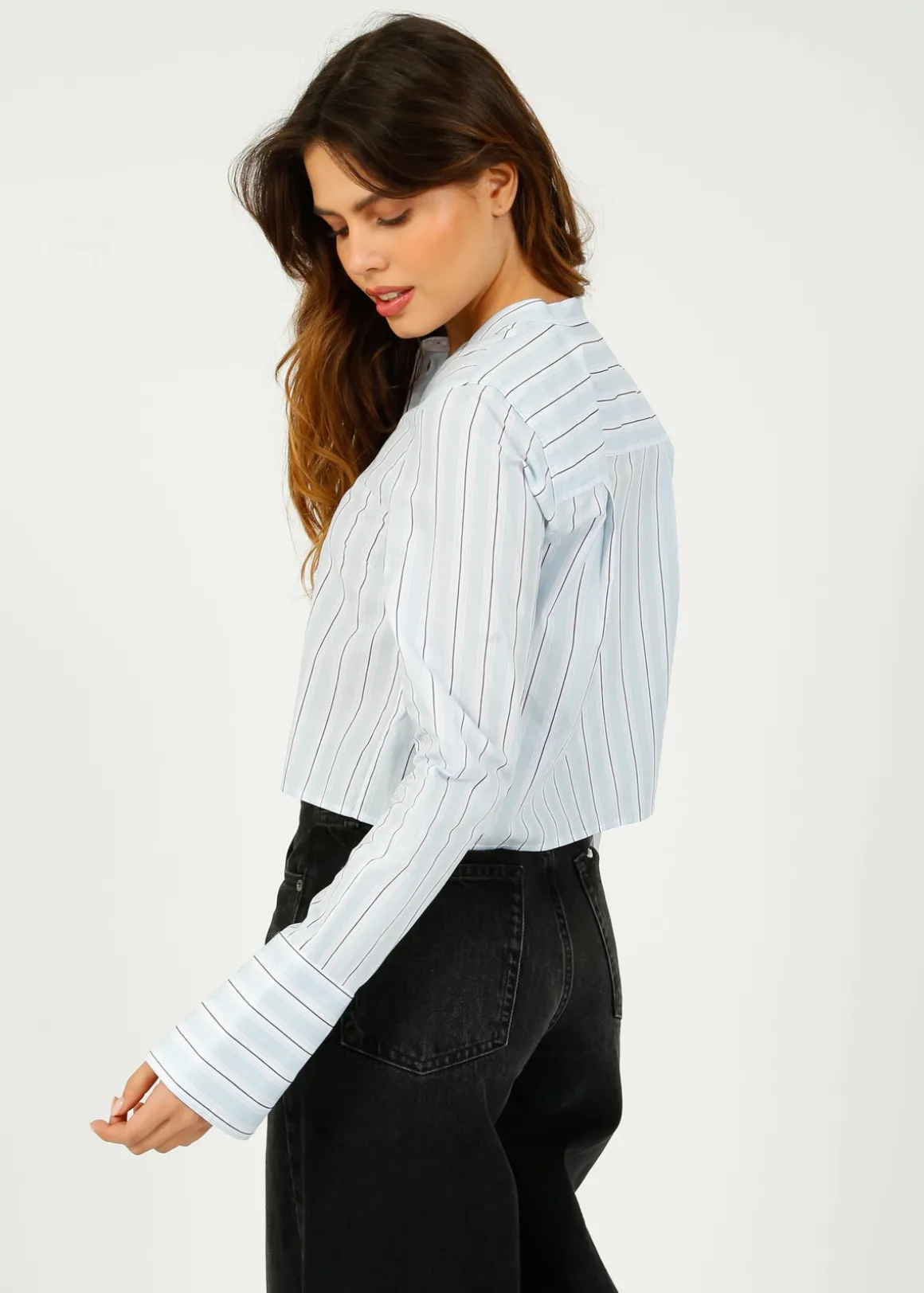 Embrace the modern twist on a classic with this button-up shirt featuring a high collar, oversized cuffs, and a cropped silhouette. The regular fit ensures comfort and style all day long!