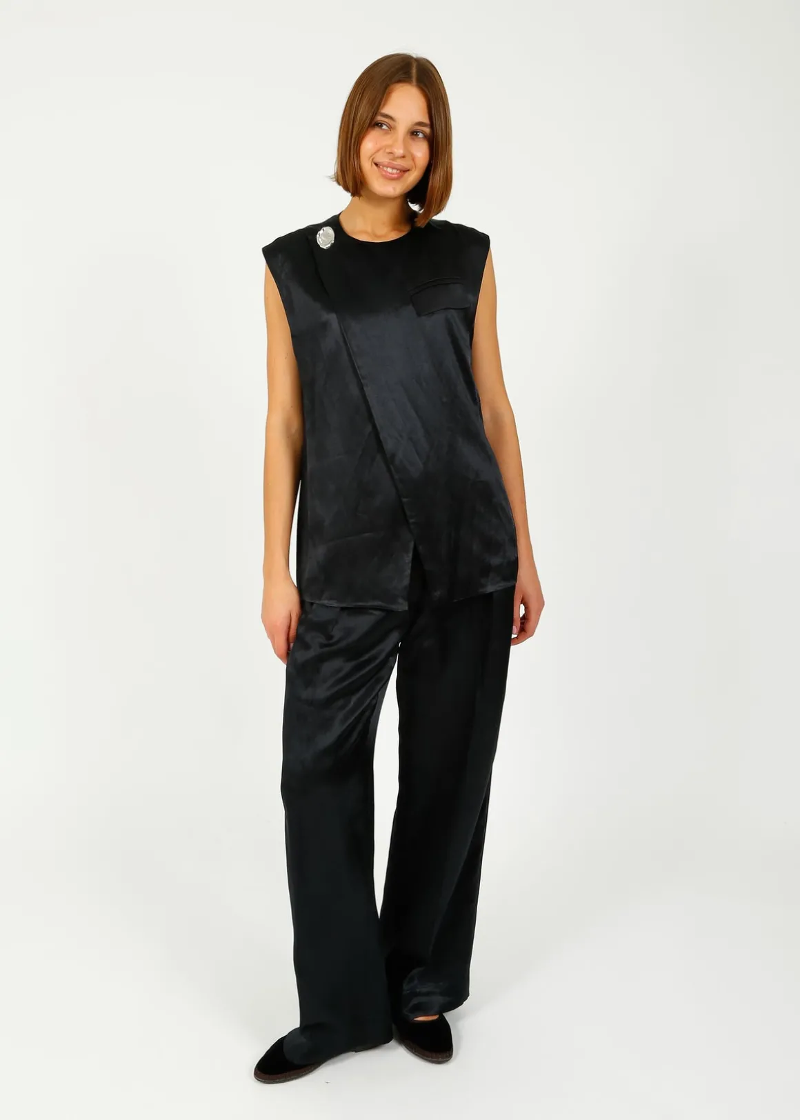 Experience a new level of style and comfort with this black DAY Marlin Top. Featuring an asymmetrical shoulder button closure, a wrap-style front opening, and an interior button for a secure fit, this top boasts a loose fit and a long slit in the back. Elevate your wardrobe with this versatile and fashionable waistcoat.
