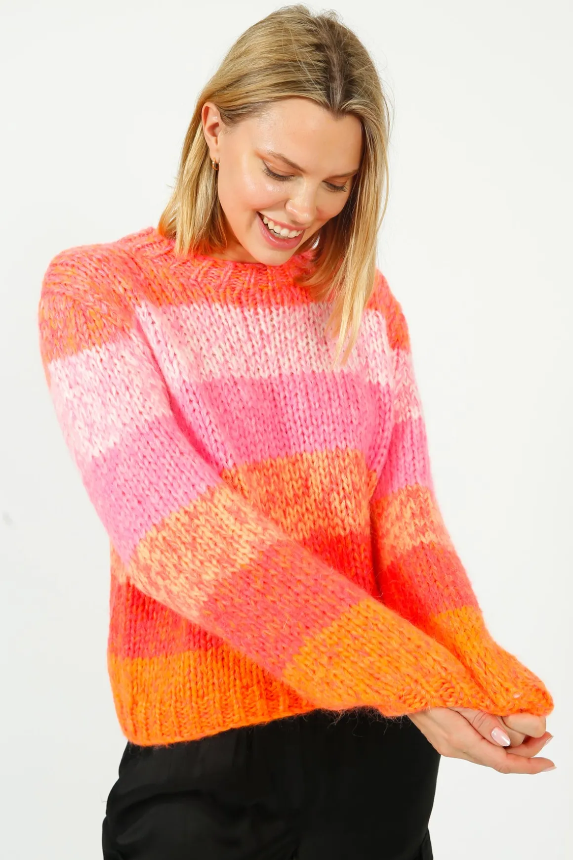 Wrap yourself in warmth and color with our Du0026amp;D Gigi Rainbow Knit Sweater. Made with luxurious mohair, this hand-knitted crewneck features bold chilli-coloured broad stripes. Plus, feel good knowing it was made by skilled Italian women. Elevate your style with this unique and cosy statement piece!